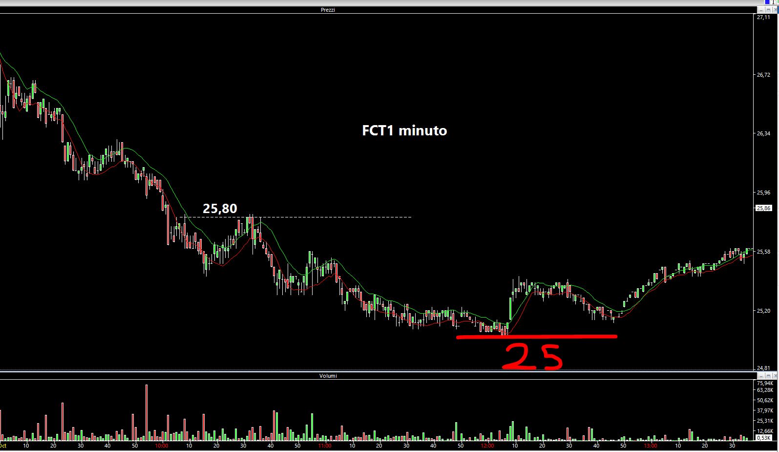 Stessa cosa dicasi nella seduta di ieri, in cui hanno preso di mira Fincantieri e il software, per creare volumi ed attirare altre macchinette (che precedono gli ordini) stava incrociando a 25,80 euro ed ho proceduto esattamente sul livello ad un sell, purtroppo chiuso immediatamente perché non ho avuto modo di spostarmi quando ho visto che il quotatore precedeva gli ordini in sell. Ma questo serve a far capire che quando la macchinetta crea volumi (incrociava appunto a 25,80), ecco che poi il titolo ha continuato a scendere, almeno fino all'area 25!