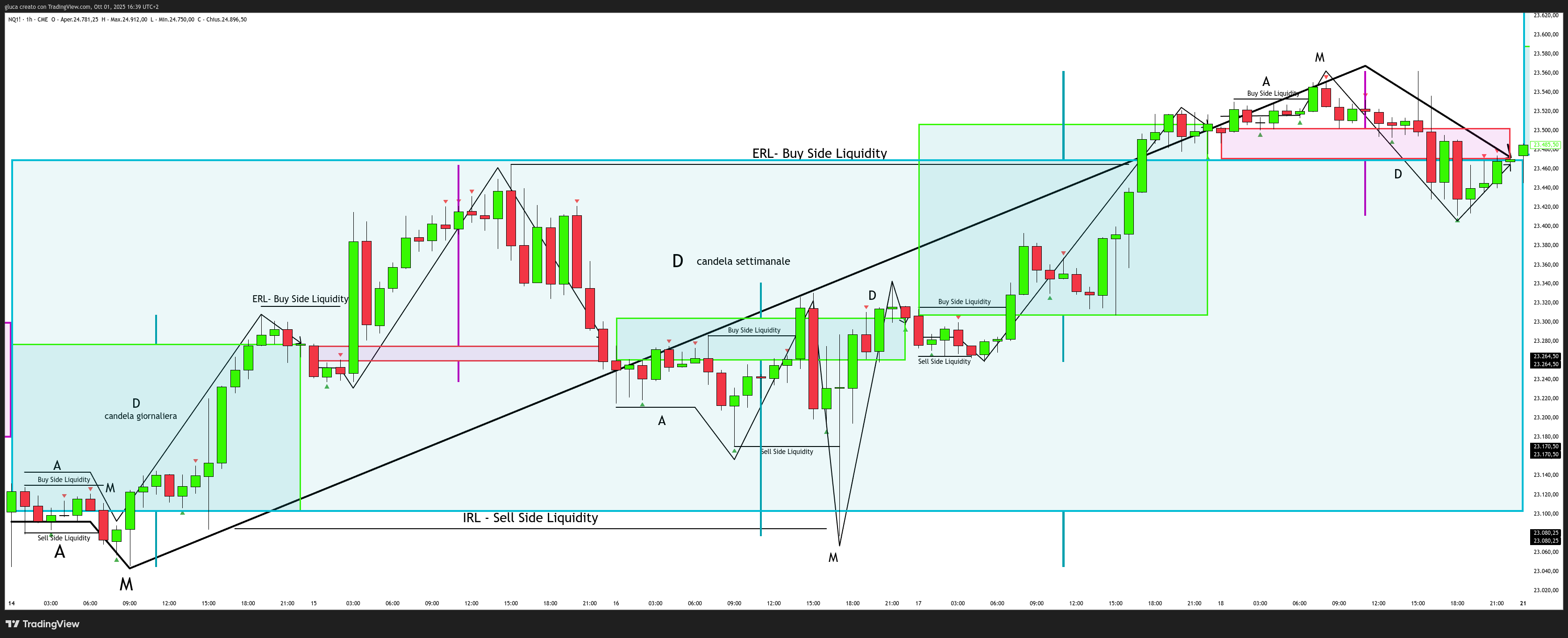 Nel contesto attuale, il comportamento settimanale delle candele riflette pienamente la logica del Power of 3: dopo una fase di accumulazione e una successiva manipolazione al rialzo, il mercato sta mostrando i segni della fase di distribuzione, con un’espansione che tende a drenare la liquidità sottostante.