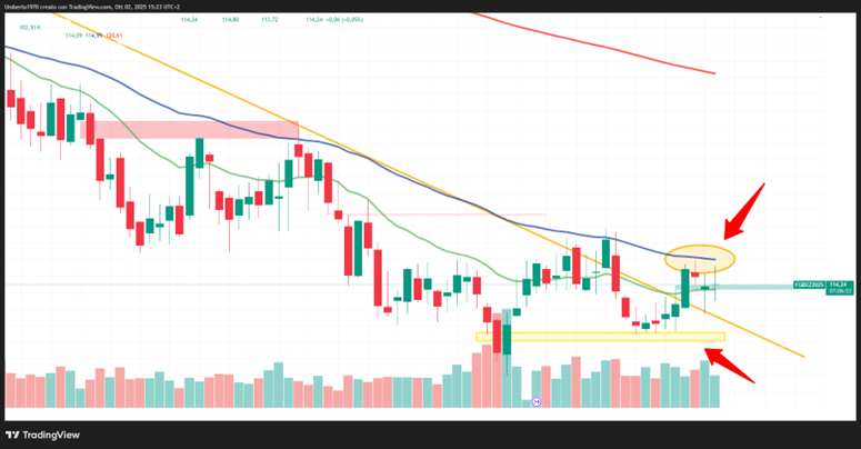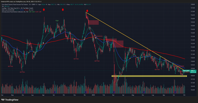 Partiamo dal trentennale, strumento parecchio volatile, definito da qualcuno un "tritacarne" se lo si trada nel verso sbagliato. Fermo restando che i tassi in area euro dovrebbero restare quelli attuali per un po' (cosa detta a parole dalla BCE, ma poi sarei curioso di vedere cosa succede se dall'altra parte dell'oceano la FED iniziasse a sforbiciare ... che a non seguirli, non oso pensare al cambio €/$ che fine possa fare : altro che problema export a causa dei dazi !) e considerato anche l'andamento della ZC-Yeld curve, sembrerebbe che i prezzi del Buxl abbiano costruito nel corso di Settembre una solida base da cui ripartire.in area 112,50 - 112,80. Un supporto che possiamo definire valido in quanto toccato ripetutatmente tutti i giorni della scorsa settimana, violato praticamente solo il 2 settembre ma subito ristabilito il 3 con una barra che ha costituito di fatto un blocco di inversione (candela il cui corpo è praticamente pari al quella del giorno precedente, ma di segno contrario, e le cui estensioni coprono quelle del giorno precedente). Nel contempo, la trendline discendente, che accompagna il future da inizio dicembre 2024, è stata violata fugacemente circa a metà mese, ma da lunedì scorso la chiusura sopra di essa è stata confermata dalle candele di tutta la corrente settimana, venendo ritestata millimetricamente giusto ieri. Il nuovo ostacolo per il trentennale è costituito, a questo punto, dalla media mobile a 50 periodi sul daily (curva blu) che per ora funge da importante resistenza. Ma parrebbe altresì supportato dall'altra media mobile a 20 periodi (curva verde). Pertanto, va posta attenzione alla potenziale area di congestione creatasi fra 114 e 115, ma occorre considerare che il superamento di quest'area verso l'alto andrebbe a configurare il pattern dell'uncino stretto a noi tanto caro e target di prezzo significativi, almeno a ridosso della media mobile a 200 periodi (curva rossa), attualmente sita in area 120,50. Quindi davvero tanta roba considerando che, su questi strumenti, una variazione di un punto corrisponde a € 1.000 di guadagno o di perdita : ergo, sempre molta attenzione anche perché lo strumento, lo ribadisco, può avere una significativa volatilità intraday. Oggi, a titolo esemplificativo, abbiamo visto tra le 10.15 e le 12.35 un'oscillazione di un punto verso l'alto, per poi assistere nelle successive due ore ad un ritorno ai prezzi della mattina (drawdown di quasi 90 bps in meno di mezz'ora) e quindi nuovamente un recupero di quasi 80 bps. Roba da farsi un secondo stipendio in giornata ma anche da rimettercelo ! Raccomando di maneggiare con estrema cura, ma attività di trading sconsigliata ai deboli di cuore.