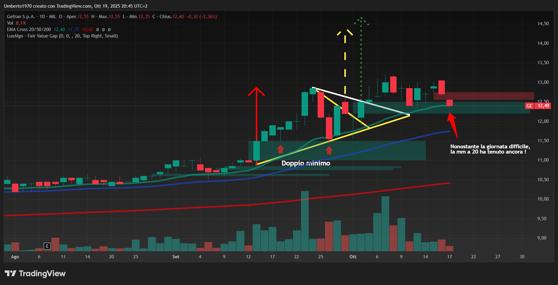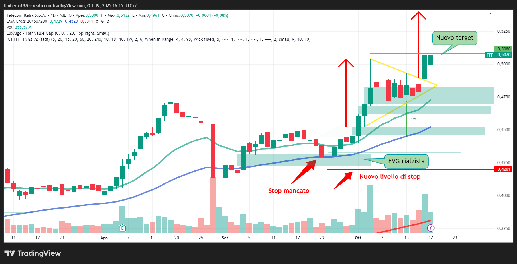 Il secondo esempio portato è la gestione del trade su Telecom. Gli abbonati hanno letto quanto mi era occorso (per chi se lo fosse perso https://www.lombardreport.com/2025/9/25/quando-lo-stop-non-stoppa/), per tutti gli altri basti sapere che l'ordine di vendita sul livello di stop era andato ineseguito. Quindi mi sono ritrovato il titolo ancora in portafoglio e ho dovuto rivoluzionare la strategia mettendo lo stop a € 0,42 sotto l'area di FVG rialzista creatasi (un pelino al di sotto per evitare "spazzolate" facili di cercatori di stop loss) ed aspettando (pazientemente) l'evoluzione del mercato. Nei giorni successivi il titolo è tornato a crescere con ottime accelerazioni a cui è seguita una fase di congestione / accumulazione che ha visto la formazione di un triangolo e di altre aree di FVG rialziste. Rotto il triangolo, sebbene la proiezione dello stesso porta in area € 0,54 il target, ho preferito portare a casa un congruo profitto a € 0,508 anche in considerazione del fatto che la giornata di venerdì 17 ottobre è stata condizionata da diversi fattori che potevano portare a sviluppi potenzialmente negativi. Fondamentali, quindi, in questa operazione, sono state le aree di Fair Value Gap che rappresentano un utile indicatore per capire se il titolo possa essere ancora oggetto di interesse o meno. E grazie alle quali possiamo riuscire a farci un'idea più o meno concreta della bontà del trade in corso. Chiaro che non è Vangelo - altrimenti torniamo al discorso fatto prima sulla semplicità delle cose - ma comunque può essere un valido aiuto per le nostre valutazioni.