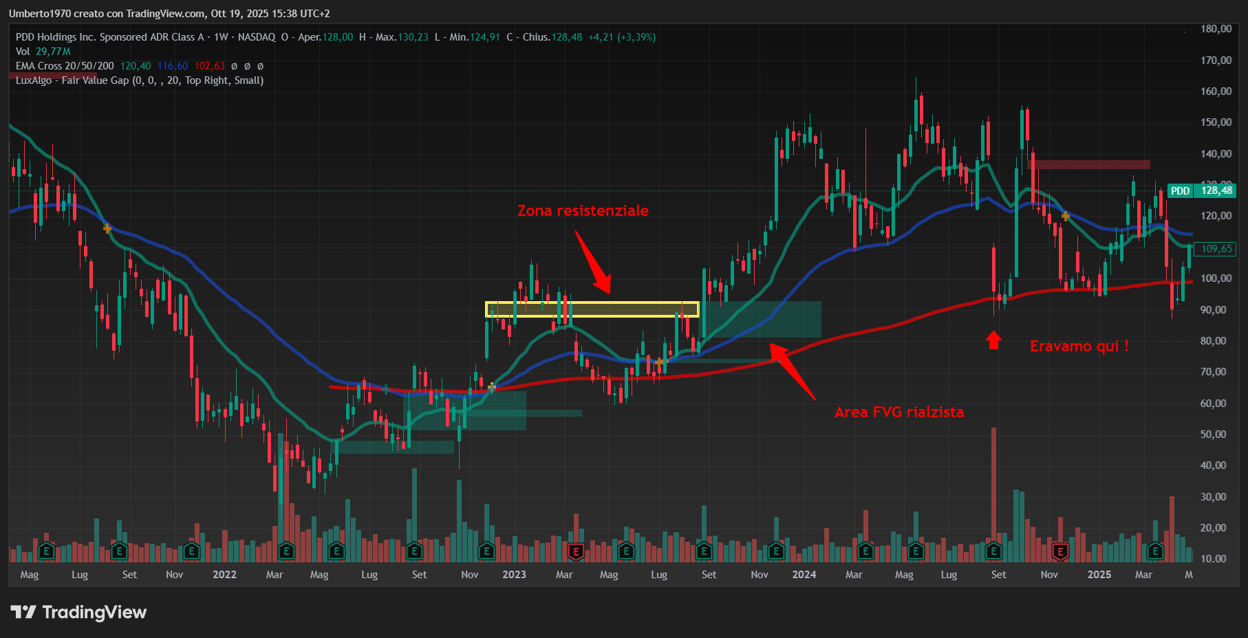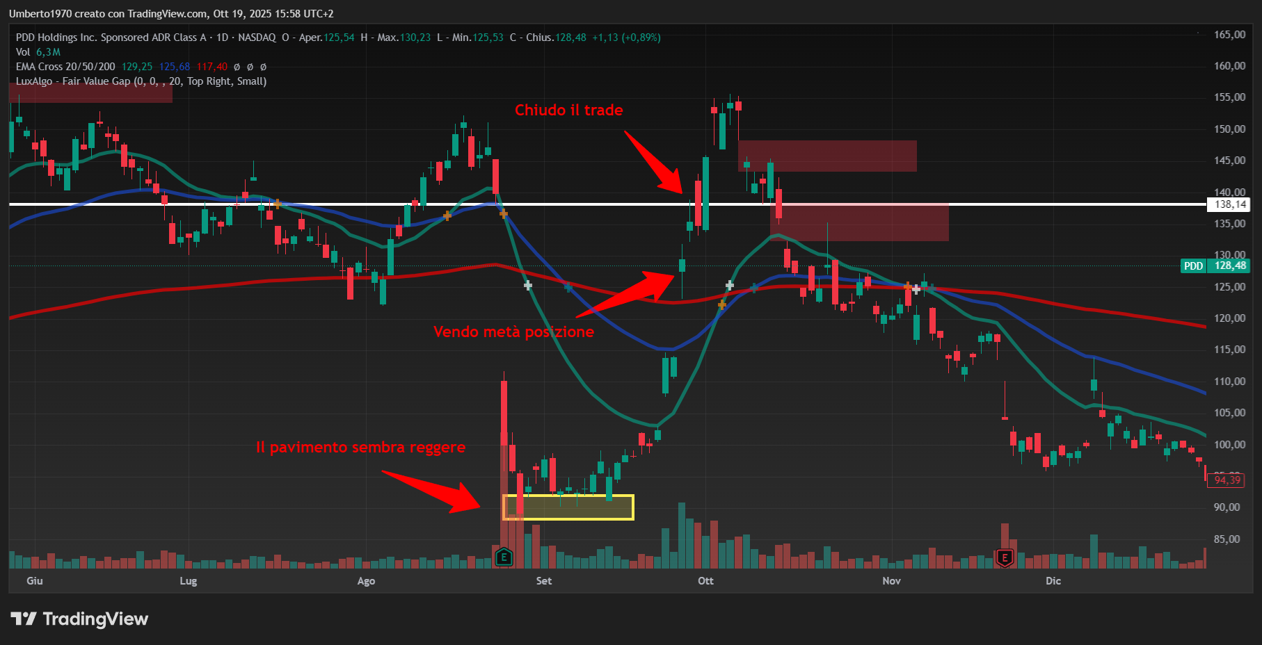 E quindi partiamo con la prima buona pratica : un trade iniziato l'estate scorsa su un suggerimento arrivato da queste colonne. Buy limit $ 110 su PDD Holdings, stop loss $ 93,29, target da comunicare. Io non vedo il suggerimento in tempo reale, e quando poi lo leggo vado a vedere la situazione sul grafico : il titolo, dopo aver aperto in pesantissimo gap down, ha perso una decina di dollari rispetto al punto di ingresso e sembra che la sua corsa verso sud voglia continuare. L'azienda è la holding che fa riferimento a Temu, principale concorente di Alibaba e Amazon nelle vendite online : azienda di un certo spessore, quindi, ma che presenta il vizio di una volatilità estrema sul Nasdaq, ragion per cui gap up e gap down sono piuttosto frequenti, così come pure barre estese che portano a segni a doppia cifra ambo i lati. Roba per cuori forti, sotto un certo punto di vista, ma roba che porta delle opportunità di guadagno oggettivamente interessanti senza i rischi di una "penny stock". Detto che comunque su un trade consigliato non si può non dare uno stop (mentre per il target si può valutare con più calma), l'analisi che faccio per andare a vedere dove potrebbe terminare la sua folle corsa al ribasso mi porta a vedere che sul grafico weekly siamo nei pressi di una zona che in precedenza ha fatto da resistenza e che quindi ora potrebbe fungere da supporto, oltre che nei pressi della media mobile a 200 periodi e senza trascurare il fatto che il trend è al rialzo da un anno e mezzo con dati aziendali che continiuano ad essere molto buoni. Vedo altresì che più indietro è rimasta attiva un'area di FVG rialzista. Nel frattempo il titolo ha toccato area 96 e cerca di risalire : faccio due conti della serva al volo e decido di entrare a mercato a $ 99,80 : il rischio c'è perché il trade è diventato pericoloso, ma il gap da ricoprire è davvero goloso a $ 138,14. Metto uno stop a -15% con l'impegno di rivederlo ma non metto ordine di vendita : voglio vedere cosa succedrà nei giorni a venire. Calma e pazienza, come scrissi al tempo, che se la roba è buona, quello che ha perso lo può recuperare, magari anche abbastanza in fretta visto la grande volatilità da cui è caratterizzata. Ci vuole un mese, ma alla fine la porto a casa. Il ritraccio arriva fino ad $ 88, purtroppo chi ha seguito con disciplina le indicazioni viene sbattuto fuori (ma, ribadisco, giusto così), si crea nei giorni a seguire un discreto pavimento con volumi che tornano a crescere (cosa che mi dà fiducia) e sulla seconda apertura in gap up vendo metà della posizione per vendere poi l'altra metà alla ricopertura del gap. Titolo ostico, ma andare alla ricerca dei gap da ricoprire è un ottima tecnica per fare dei realizzi interessanti. Chiaro che non è sempre così veloce, ma soprattutto non scontato ... altrimenti sarebbe tutto troppo facile. Mentre di facile non c'è nulla nella vita !