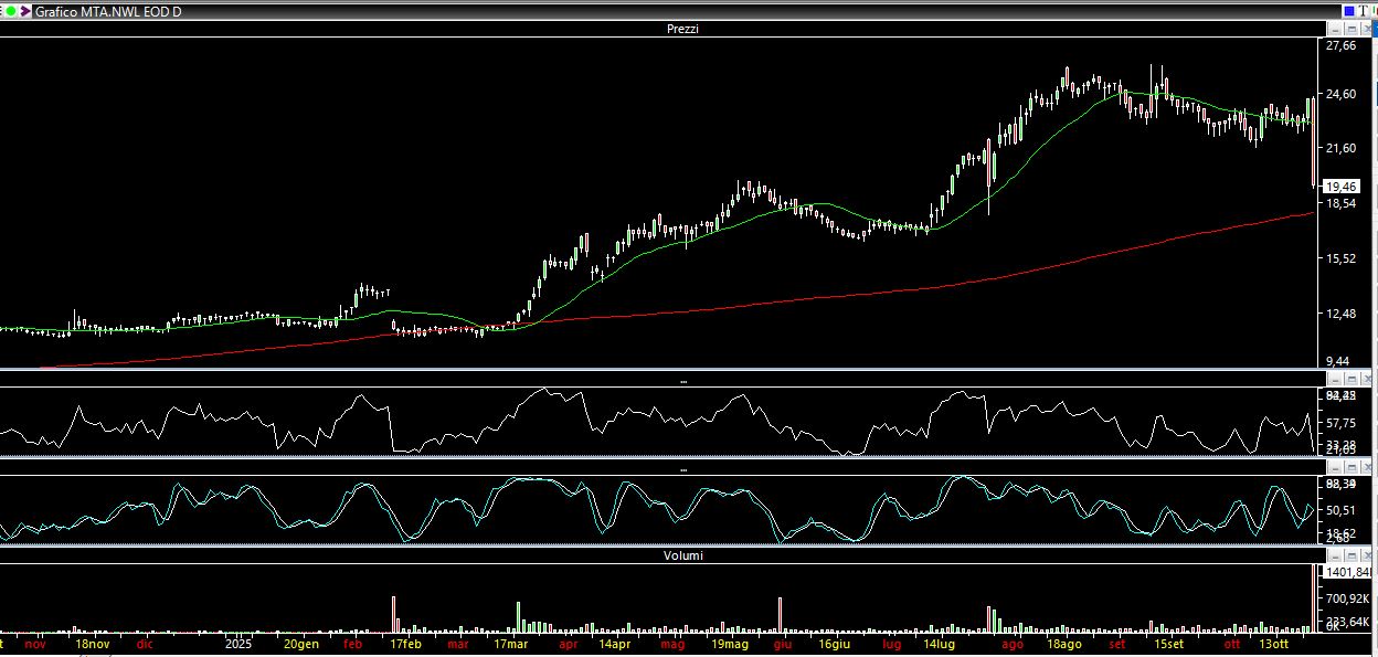 Il tema del giorno è tuttavia stata NewPrinces (la ex Newlat per intenderci). Nel webinar di ieri un ascolatore mi ha domandato cosa ne pensassi. Aveva rotto una congestione ed avevo indicato uno stop secco attorno a 22.50 euro (vado a memoria) menzionando il fatto di stare molto attenti alle notizie perché qualche mese fa proprio in seguito ad una news il titolo era crollato del 15-20%. Oggi il fattaccio si è ripetuto: -20% a fine seduta in seguito alla notizia di una quotazione alla Borsa di Londra con prezzo sotto le attese. Pur non avendone mai più scritto, stop profetico (se applicato). Come ho avuto modo di evidenziare a Modena la connivenza e la mancata proibizione dei software porta ad una Borsa fuori controllo. e questo è a mio avviso gravissimo, perché le autorità dovrebbero tutelare il risparmio e non permettere che si verifichi la mattanza da parte degli algoritmi.