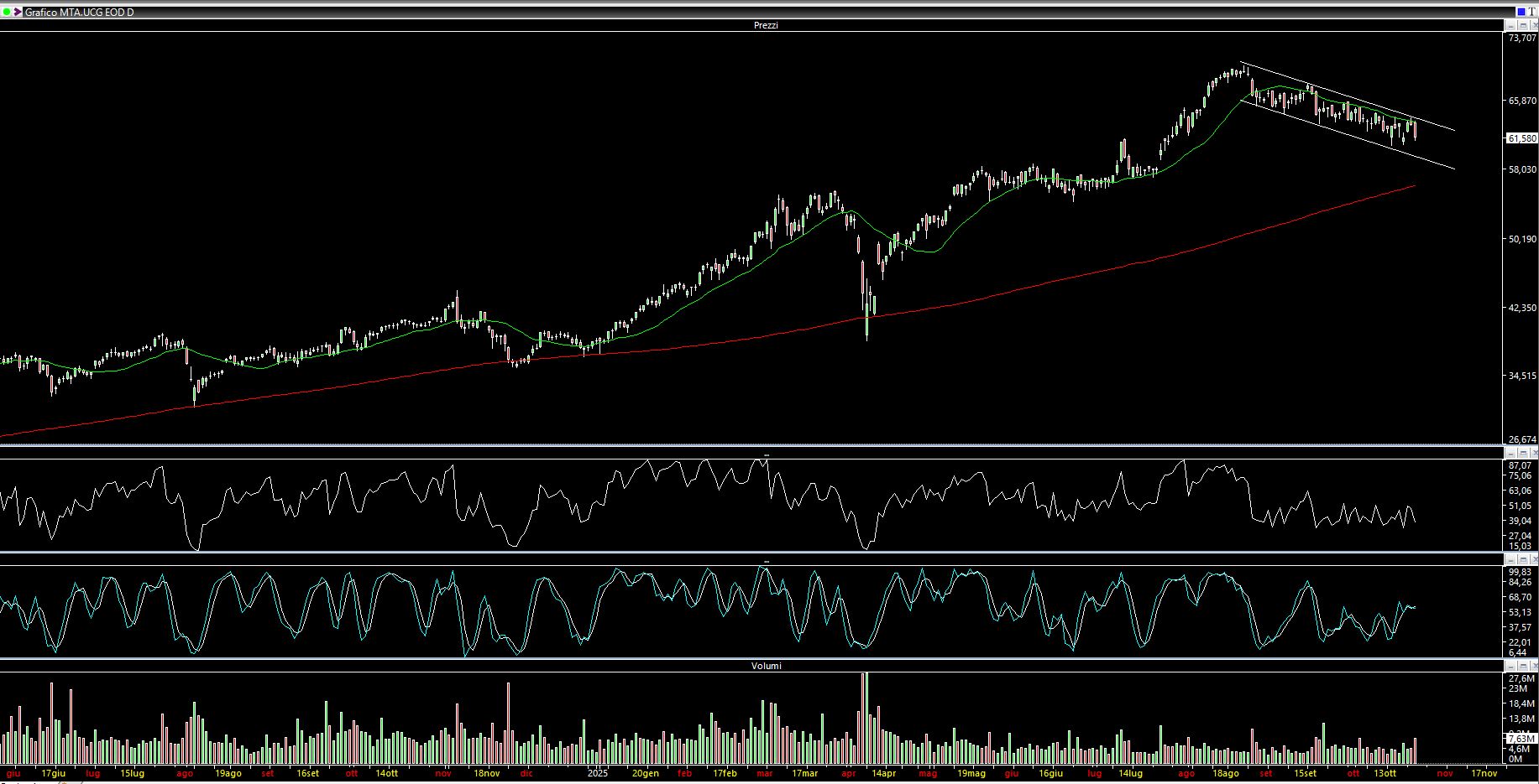 Buona serata a tutti. Dopo la convention di Modena ed il mio webinar andato in onda ieri sera, riprendo brevemente con l'analisi di qualche grafico. Oggi ho operato molto poco a causa di un blackout della rete internet che so aver coinvolto mezza Italia. Non è questo il punto. Ieri ho fatto cenno alla perdita di appeal del settore bancario a causa del venir meno del discorso fusioni, salvo forse qualche exploit subito rientrato. Nella seduta odierna Unicredit ha pubblicato i conti e, pur essendo stati buoni, è mancato l'effetto wow e così il titolo è stato punito con un ribasso del 2,32% e così il titolo prosegue nel trend discendente accompagnato dalla media a 20 periodi di colore verde. Ricordo che lo avevamo cavalcato egregiamente nell'ultima gamba rialzista e poi ne siamo usciti.