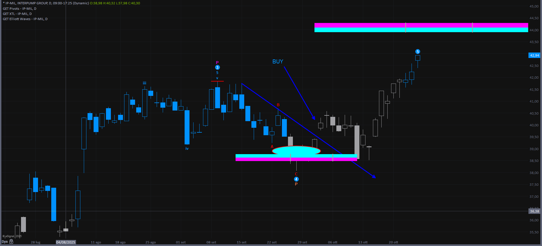 Nessun segnale di ingresso sul titolo (lo avrebbe dato in intraday, ma è necessaria almeno una chiurura sopra la trendline perchè sia un segnale da seguire.