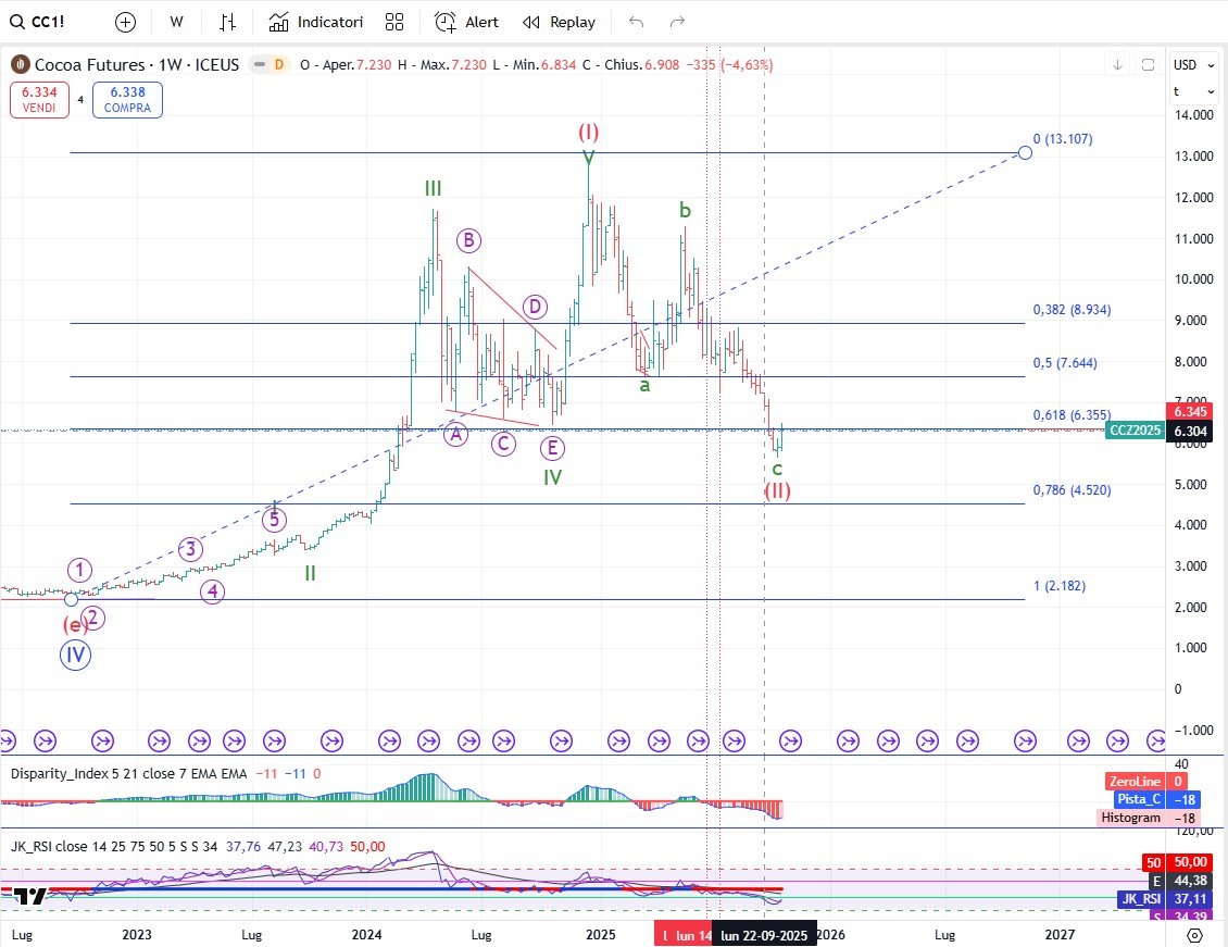 Sul Cacao la lunghezza di onda c ha ormai superato la lunghezza di onda a per cui in linea teorica dovremmo essere alla fine o molto vicini alla fine dell’onda correttiva. Le ultime due sedute della settimana sono state al rialzo adesso aspettiamo qualche conferma prima di aprire posizioni al rialzo anche perché se siamo all’inizio della (III), di strada da fare ce ne sarà parecchia per cui non c’è da aver fretta.