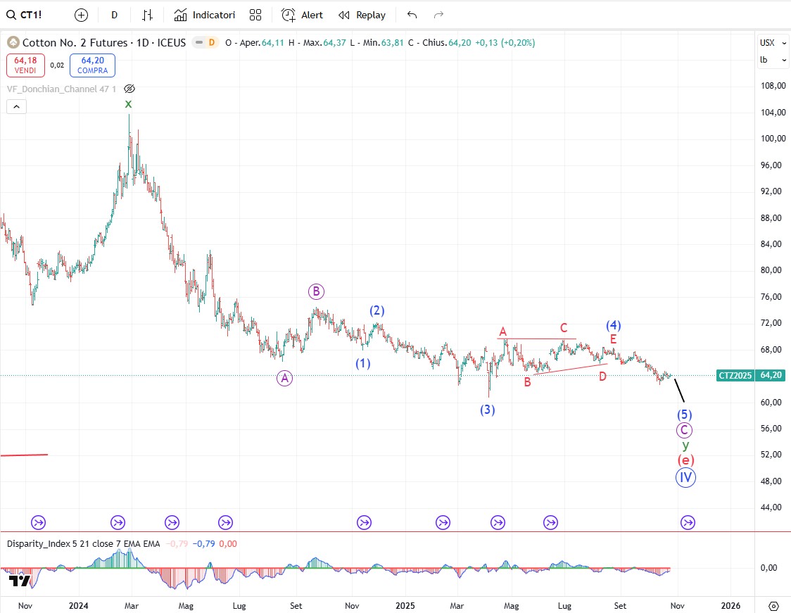 Il cotone lentamente continua a suddividere l’onda (5) ribassista. Aspettiamo che arrivi in fondo poi vedremo.