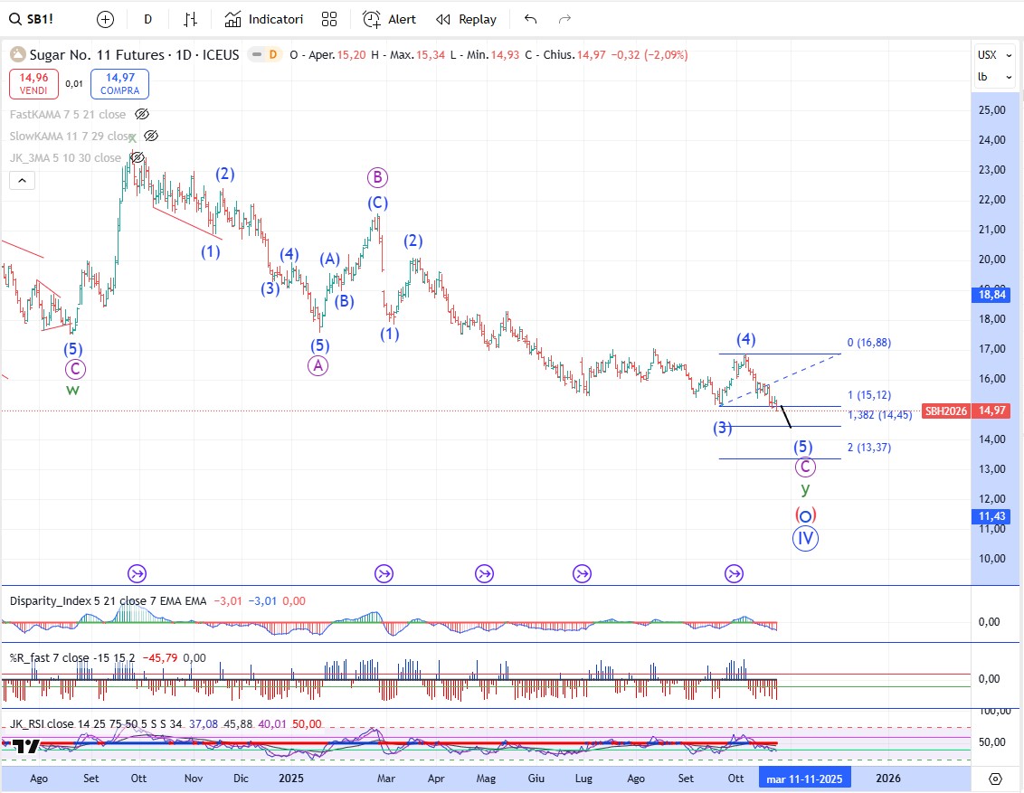 Lo zucchero è nella stessa situazione del cotone. Deve completare l’onda (5) ribassista che comunque è già scesa sotto al minimo di onda (3) per cui potrebbe anche non richiedere troppo tempo. Una volta conclusa la fase ribassista cercheremo un 1-2 al rialzo e e la conferma di qualche indicatore prima di aprire posizioni rialziste.