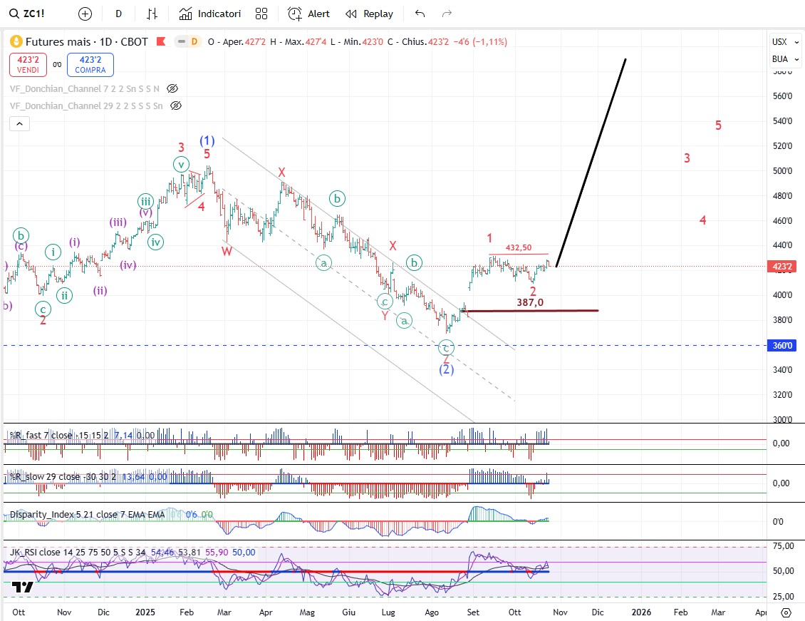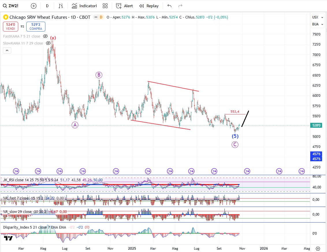 Il grano sembrerebbe aver trovato un minimo. Ora però servono conferme sia in termini di moto d’onda che di indicatori. Quando saremo pronti andremo al rialzo.