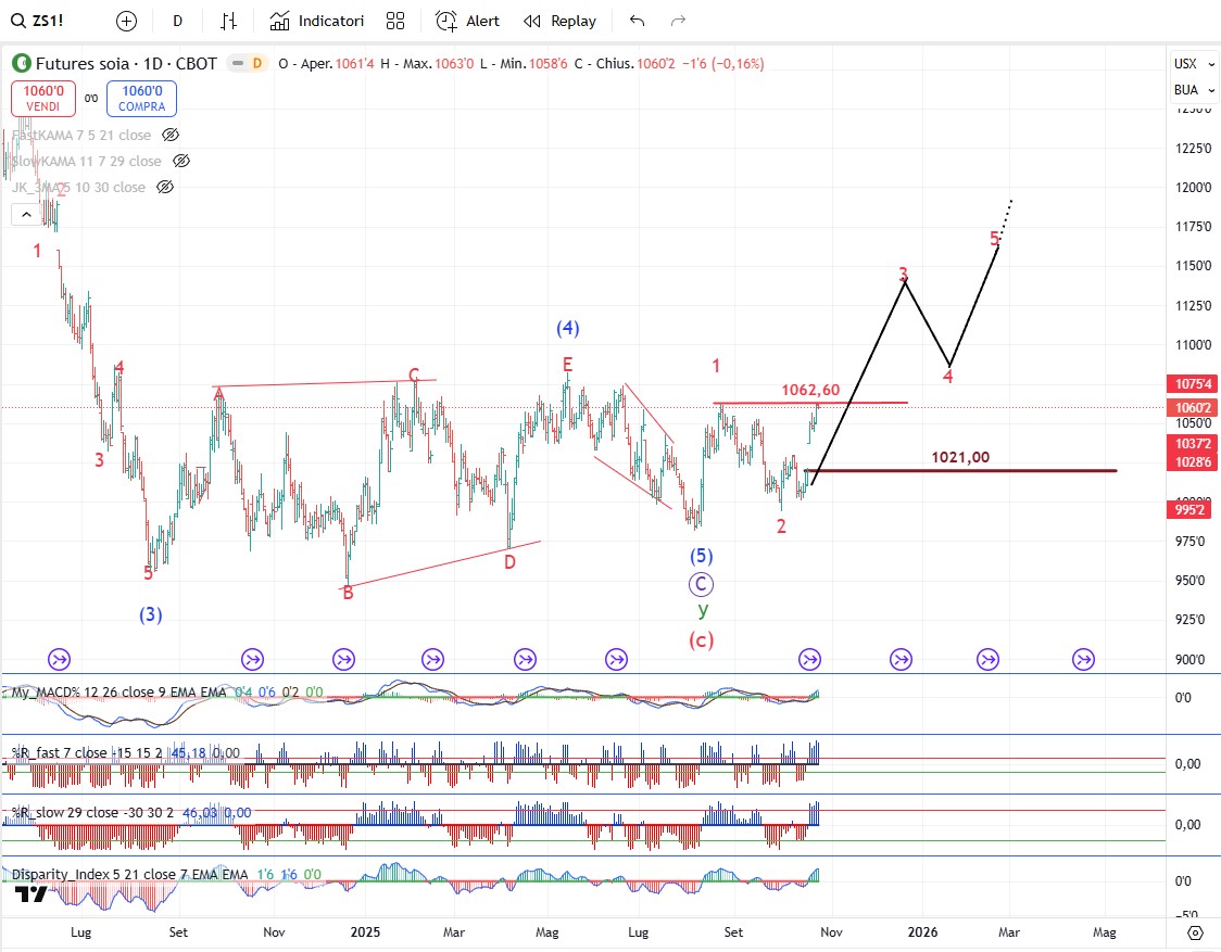 Anche sulla soia siamo vicini alla soglia di entrata. Aspettiamo una chiusura sopra 1062,60 per aprire una posizione long.