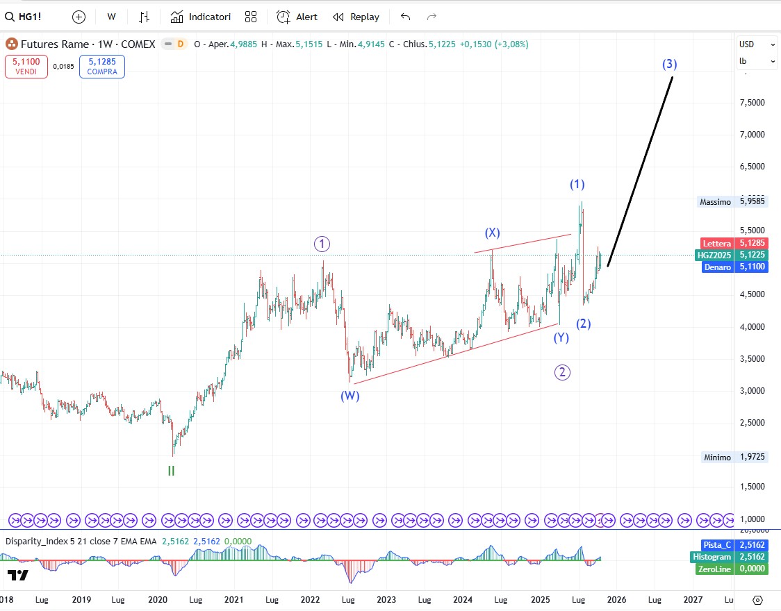 Ci sbaglierò anche stavolta ma tanto sul rame non sarebbe la prima volta. Ultimamente mi da l’impressione di voler andare al rialzo. Non è un trend forte e irresistibile ma sembra aver più voglia di salire che di scendere. Quindi ho modificato il conteggio rispetto alle ultime volte precedenti e speriamo bene. Da seguire