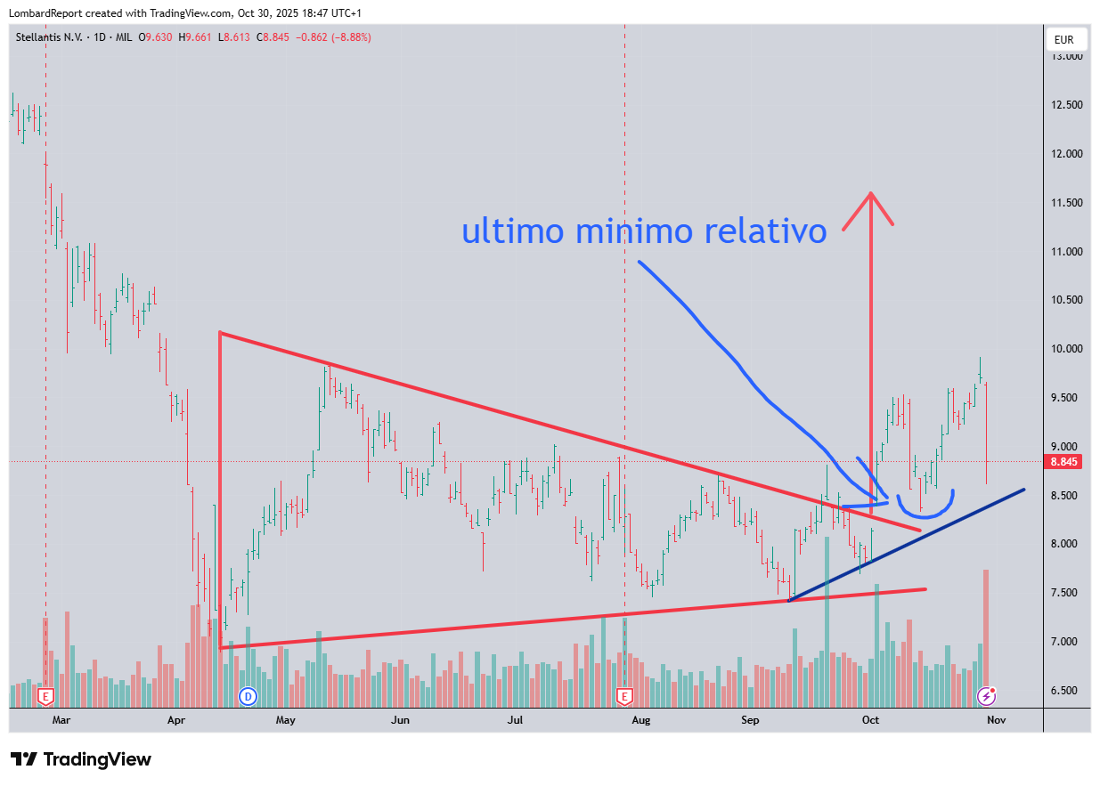 Oggi è stato il giorno di Stellantis che ha vissuto momenti difficili. La chiusura è stata brutta, non c’è da dire nulla di più. Però dobbiamo tenere in conto che siccome non possiamo prevedere il futuro ci dobbiamo basare sui dati che abbiamo in mano. E i dati che abbiamo in mano sono sotto il profilo fondamentale il rialzo dei ricavi e delle consegne nel terzo trimestre dopo 7 trimestri di calo e soprattutto a livello tecnico un bottom up che nonostante il ribasso di oggi rimane intonso. Come dimostra il grafico siamo a cavallo della trendline di breve e comunque sopra il minimo relativo precedente. Io terrei botta, abbiamo resistito finora e scappare ora non avrebbe senso, almeno per il portafoglio Challenge.