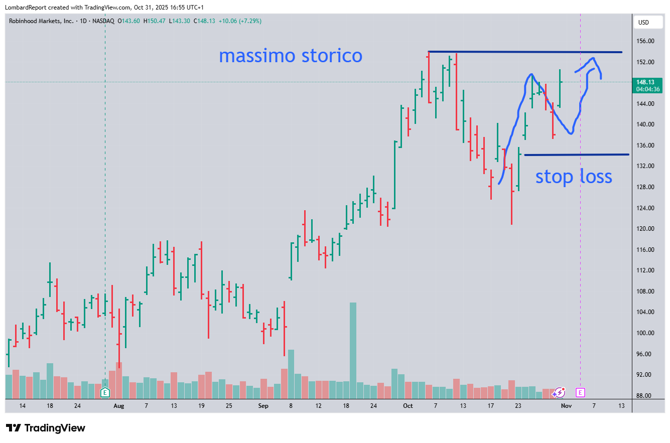 Dopo il ribasso di ieri pensavo che RobinHood sul Nasdaq andasse al ribasso ed invece ha realizzato oggi un bellissimo uncino sotto i massimi storici, ovvero il nostro pattern.