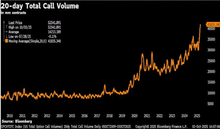 La speculazione viaggia ormai su livelli inter stellari. Circa un terzo di tutti gli ETF azionari lanciati sul mercato quest'anno include la leva finanziaria. L'uso del margine e della leva finanziaria per controllare grandi blocchi di azioni con blocchi di denaro più piccoli attraverso le opzioni sta procedendo a ritmi record e a settembre il volume delle opzioni azionarie statunitensi ha raggiunto il livello più altro di sempre. I dati mostrano che, in totale, il mese scorso sono stati negoziati 1,4 miliardi di contratti di opzione, con un aumento del 45% rispetto a settembre dello scorso anno. L'impennata è stata trainata da un aumento del 67% del volume delle opzioni su singole azioni rispetto allo stesso periodo dell'anno scorso. Il grafico qua sotto mostra la media a 20 giorni del volume totale delle call negoziate su tutte le borse.