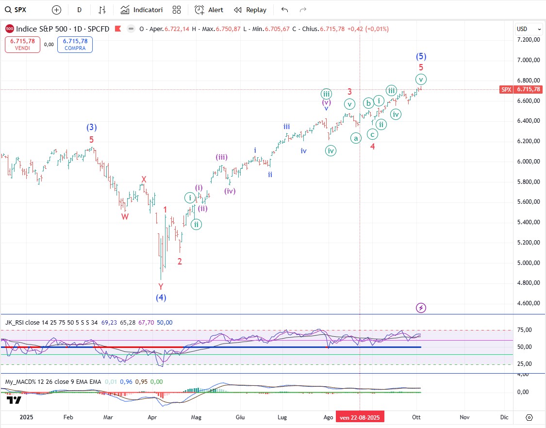 Sull’S&P500 l'onda 5 ha raggiunto 6750,87 punti in intraday, 15 punti sopra il livello in cui l'onda [v] di 5 è il 61,8% di onda [i] di 5. Lo sviluppo di onda 5 ormai appare decisamente maturo, poi nessuno vieta che si possa salire ancora, ma ad ogni nuovo massimo le probabilità di restare col cerino in mano aumentano. Poi ambasciator non porta pena.