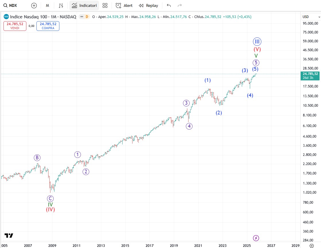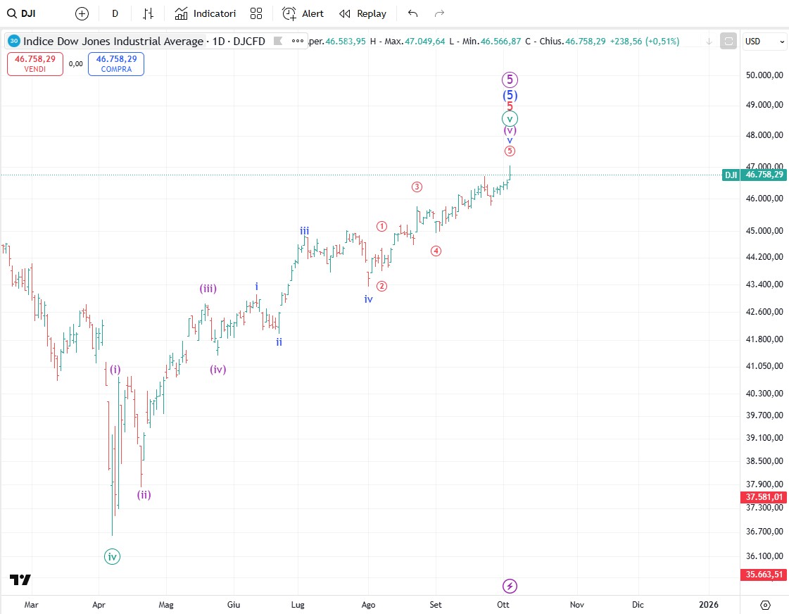 Il Nasdaq100 ha raggiunto un nuovo massimo intraday venerdì a 24.958,26, ma ha chiuso la giornata in ribasso. Anche in questo caso l’onda (5) è circa il 61,8% di onda (1) per cui le condizioni di minima per dichiarare chiusa l’onda (5) sono soddisfatte.