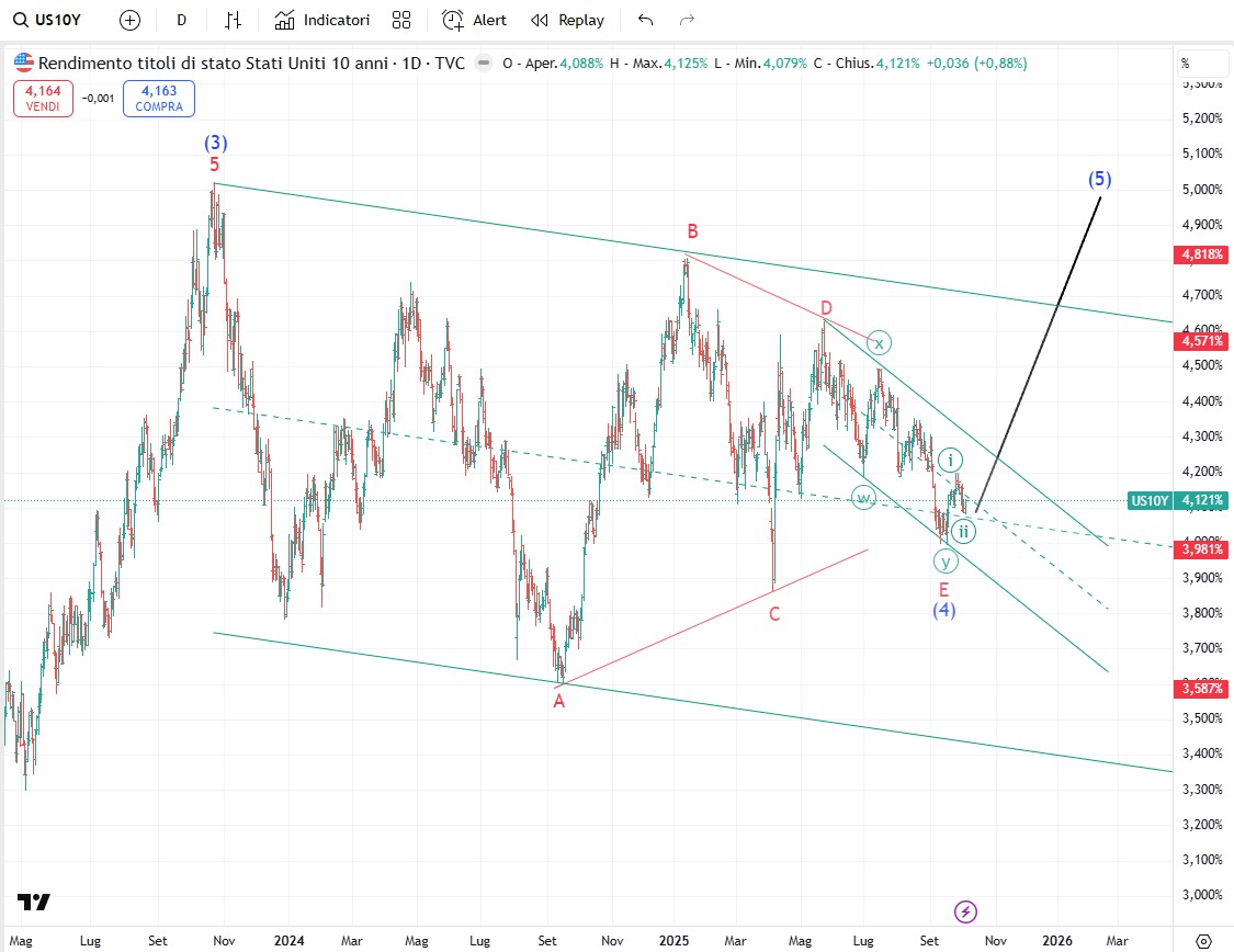 Il rendimento del decennale americano sembra aver tracciato l'onda [i] di 1 di (5) dal 3,988% al 4,154% il 22 settembre. L'onda [ii] ha assunto la forma di un andamento flat, che potrebbe essere appena terminato o in via di terminazione al 4,077%, avendo già ritracciato quasi il 50% di onda [i] . Se il nostro ragionamento è giusto l’onda [iii] partirà presto portando un forte aumento dei rendimenti. Primo target al 4,4%. Dopo, l'onda (5) porterà i rendimenti oltre il 5,021%, il picco dell'onda (3). Il livello chiave per questo scenario rimane il 3,988%. Una rottura del 3,988% aprirà il pattern a diverse opzioni a breve termine che analizzeremo se sarà necessario.