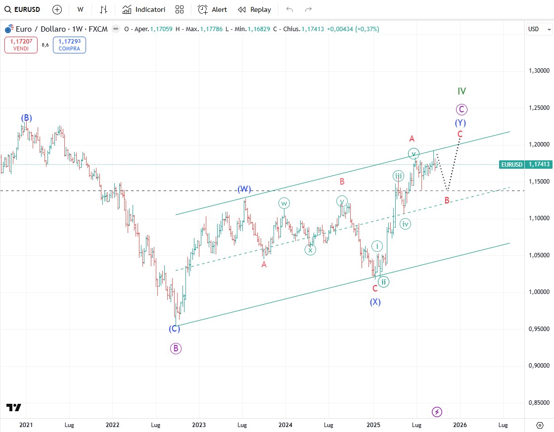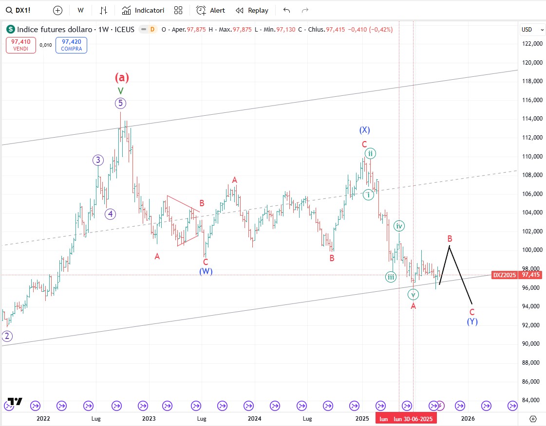 Sul Dollar Index e sull’Euro Dollaro per ora non è cambiato nulla. E’ sempre in corso lo sviluppo dell’onda B che potrà portare o alla formazione di un Flat o di un triangolo. Situazione da seguire.
