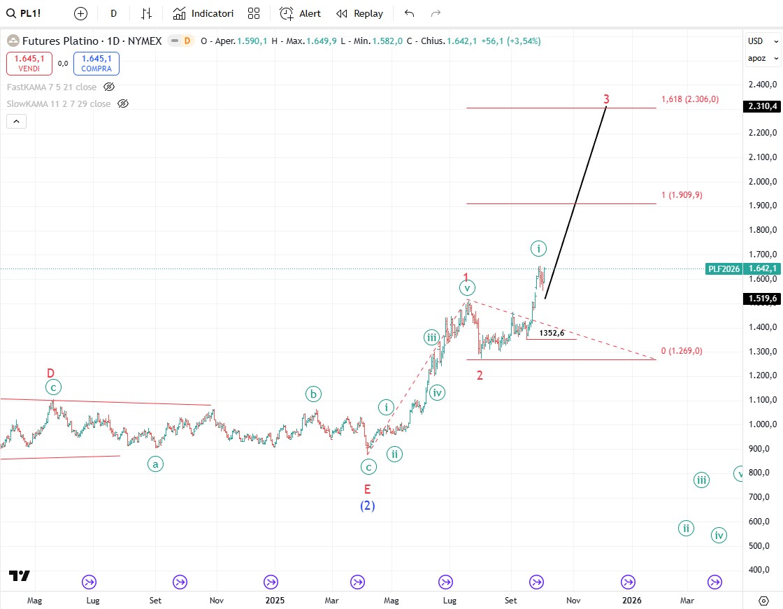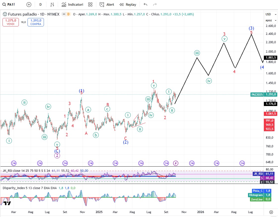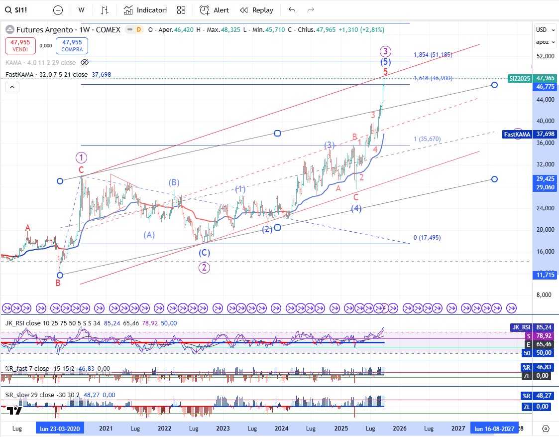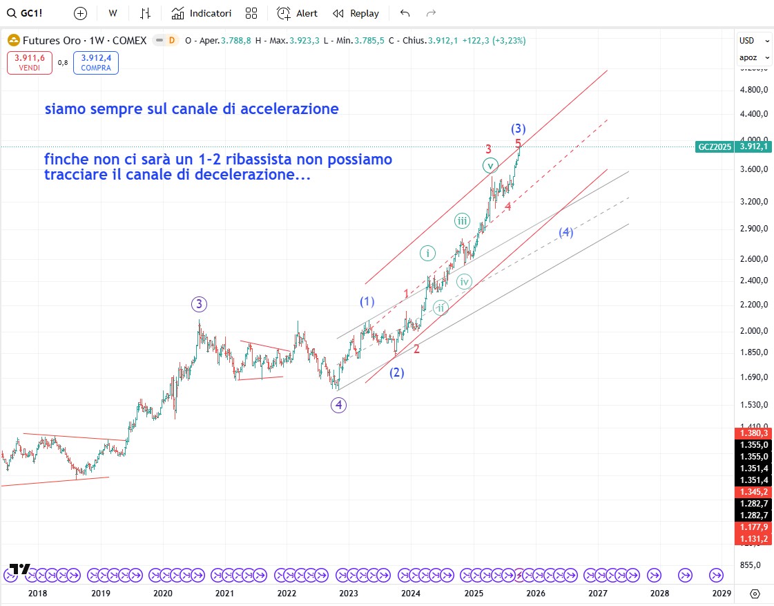 L'oro ha raggiunto un nuovo massimo a 3.896,79 dollari il 2 ottobre, e si è mantenuto vicino a quel massimo anche venerdì. I prezzi sono a ridosso della sponda superiore de canale di trend ascendente per cui ci sta che lo senta e parta una correzione ma ci sta pure che rompa e prosegua la galoppata verso il prossimo target che si colloca attorno a quota 4068-4070$. Il consenso rialzista di Market Vane il 2 ottobre ha registrato il 91% che è un valore che si riscontra raramente ma nelle fasi finali di un’onda terza ci sta. Da seguire.