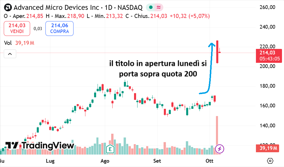 Questo per arrivare a dire che…ieri in apertura il titolo si è portato sopra quota 200 dollari per azioni. In particolare, AMD è passato dalla chiusura di 164,67 di venerdì all’apertura di ieri a 226,45.