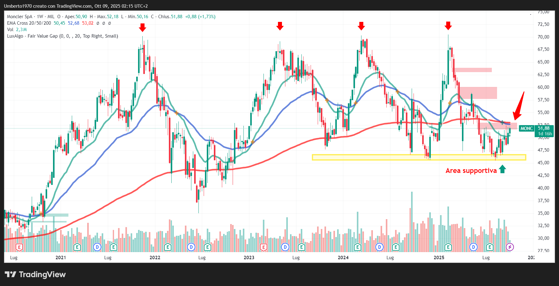 L'analisi odierna si sposta poi su Moncler, altra azienda che ben conosciamo. Guardandone il grafico, sul finire delle stagioni invernali il titolo è sistematicamente andato a raggiungere i massimi in area € 70. E quindi vien da dire : "Ooops, I did it again". Lo rifarà anche con l'arrivo del 2026 ? Non possiamo saperlo, ma è un fatto che l'andamento degli ultimi tre esercizi è "circa, largo, quasi" sostanzialmente sovrapponibile e consta, oltretutto, di una solida base di appogio. I fondamentali viaggiano anch'essi sulla falsa riga di quanto visto in passato e, considerato le temperature piuttosto frizzantine che stiamo registrando in questi primi giorni di ottobre, tutto sembra propendere per una nuova stagione di vendite sui massimi livelli. Problema dei dazi per il mercato americano a mio avviso inesistente : chi compra Moncler non guarda al prezzo e cerca qualità associata al "made in Italy", così come avviene per tanti altri marchi iconici del nostro paese all'estero. Il segnale di acquisto potrebbe essere, ancora una volta, il superamento della media mobile a 20 periodi su quella a 50 sul grafico settimanale, senza considerare che quella a 200 ha appena incrociato al rialzo quella a 50 : se non è un segnale di forza questo ... Volumi poi sempre belli pimpanti, e quindi diciamo che anche quest'anno le premesse per un trade profittevole ci sono tutte.