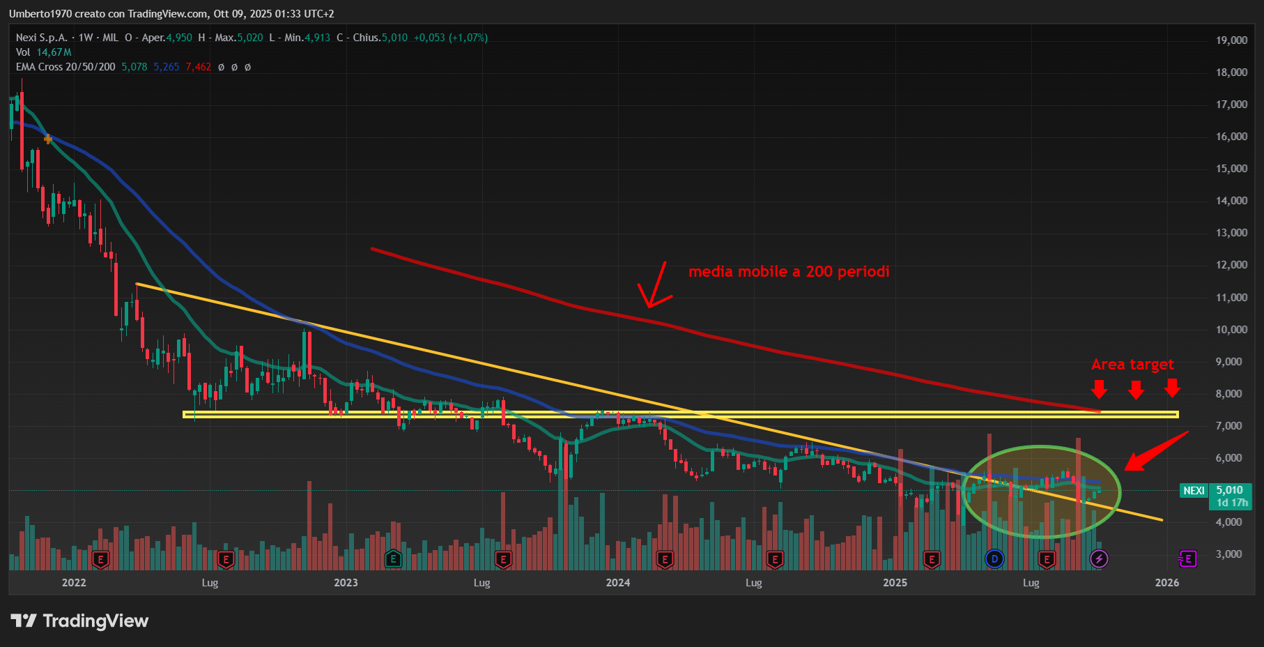 La seconda "nobile" decaduta è Nexi, altra nostra vecchia conoscenza. Finita in disgrazia anch'essa quattro anni fa, ha seguito un lungo ed inesorabile declino fino a toccare il minimo storico ad inizio primavera; ma da allora pare aver trovato un po' di entusiasmo riuscendo a maggio a rompere una prima volta la lunghissima trend line discendente, e poi una seconda tra fine giugno ed inizio luglio. Trend line che poi è stata millimetricamente ritestata ad inizio settembre per poi ripartire verso l'alto per cercare di recuperare finalmente un po' di splendore. Ora : le metriche di profittabilità non sono una meraviglia, ma per lo meno sono stati abbandonati i bruttissimi segni negativi di fine 2023. Utili e ricavi sono previsti in crescita per il secondo semestre 2025 e alcuni parametri tecnici sono tornati ad indicare la fattibilità di operazioni long. Il tutto accompagnato da un sentiment positivo da parte degli analisti e da volumi che durante tutto quest'anno non sono mai mancati (sintomo che, nonostante tutto, c'è "hype" sull'azienda). Morale : anche questo titolo va considerato nell'ottica di una buy opportunity, ferma restando la sua permanenza al di sopra della trend line discendente di cui sopra. Un'ulteriore conferma potrebbe venire dalla chiusura sopra area 5,70 e con obiettivo la media mobile a 200 periodi sul weekly che al momento transita in un'area (7,30 - 7,50) che in passato è stata prima supportiva e poi resistiva.