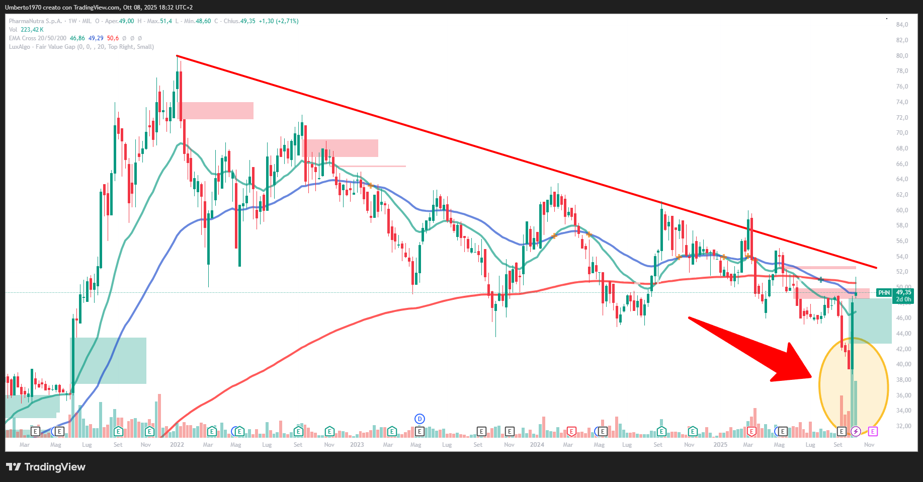 La prima di queste "cenerentole" è una nostra vecchia conoscenza : Pharmanutra, società che abbiamo tradato in passato e che, tra alti e bassi, ha disegnato un percorso discendente negli ultimi quattro anni. Eppure qualcosa sta cambiando : da inizio settembre i volumi scambiati sono tornati ad essere interessanti e, dopo l'ultimo scivolone che l'ha fatta precipitare sotto i € 40, da inizio ottobre abbiamo visto una serie di accelerazioni che in questa settimana l'ha riportata a ridosso dei € 50. Sul grafico weekly vediamo che la scorsa ottava ha superato di slancio la media mobile a 20 periodi (curva verde) cercando di raggiungere quella a 50 (curva blu), linea su cui sta danzando adesso dopo aver tentato anche il superamento di quella a 200 (curva rossa). Quindi massima attenzione perché, tra il consolidamento della quotazione sopra quest'ultima e la trend line discendente di lungo periodo, "ci balla" poco ... e potrebbe essere arrivato il momento dell'inversione. A livello di fondamentali, le metriche di profittabilità sono in miglioramento rispetto allo scorso esercizio con un margine lordo che continua a sfiorare il 70% e un netto prossimo al 20%. Oscillatori e medie mobili paiono impostati su un buy deciso. In passato avevamo detto che in area € 60 poteva essere sopravvalutata, ma adesso, personalmente, la vedo come una valida buy opportunity con target progressivi dati dai vari swing high (in considerazione del pesante drawdown) ma anche ambiziosi (Berenberg ha avviato una copertura con rating "buy" e target price 85 euro - fonte Reuters ... per quanto possano valere queste indicazioni). L'azienda, tra l'altro, ha recentemente presentato un accordo per una consulenza volta a sviluppare la controllata omologa americana Pharmanutra Usa Corp. (fonte Reuters)
