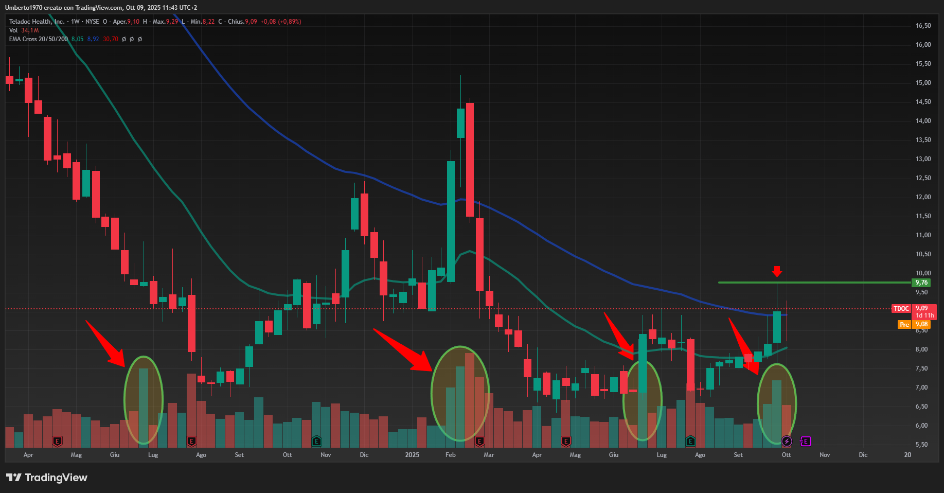 Segnalo da ultimo, davvero a titolo di scommessa e per i più esperti, l'americana Teladoc Health, quotata sul NYSE, finita letteralmente dalle stelle alle stalle nel giro di qualche anno. I fondamentali sono bruttini e le metriche di profittabilità da contorno ai film di Dario Argento, ma comunque in ripresa rispetto agli ultimi due esercizi. Nel recente passato, in occasione delle relazioni trimestrali, spesso si sono registrate "svolumate" settimanali notevoli prima dell'uscita dei dati, segno che gli amici degli amici sono probabilmente a conoscenza di quello che i retail non sanno. Risultato è che adesso siamo sui massimi da sette mesi a questa parte e il nuovo report atteso a stretto giro : un assalto all'ultimo swing rialzista costituirebbe davvero un colpo gobbo non da ridere. E, come siamo soliti dire su queste colonne, "a brigante si risponde a brigante e mezzo" ! Chiaro che lo stop sotto all'ultimo supporto in area 6,50 è tassativo, considerando il fatto che stiamo parlando di una realtà che è passata da $ 300 a $ 6,50 in quattro esercizi : male che vada, i € 1.000 puntati diventeranno € 700 / 650 .