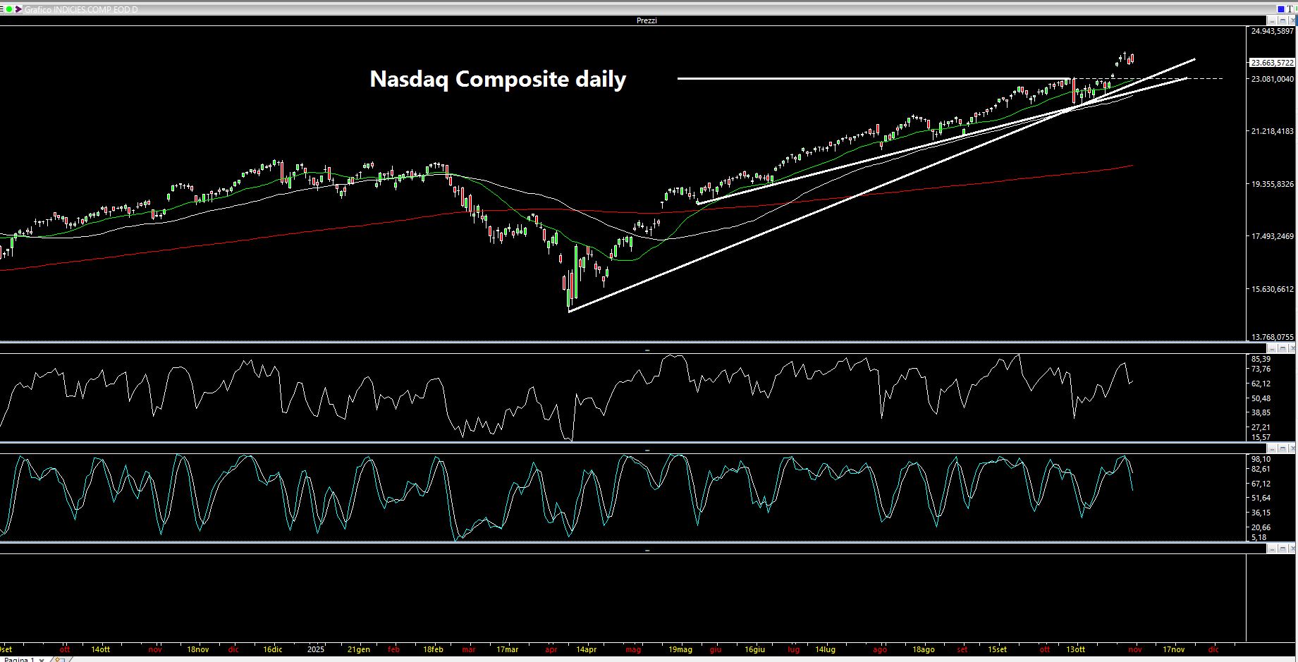 Il Nasdaq Composite rimane inchiodato sui massimi ma lascia alle proprie spalle un paio di gap up e sarebbe bello vedere un pullback verso i 23100 (linea tratteggiata)