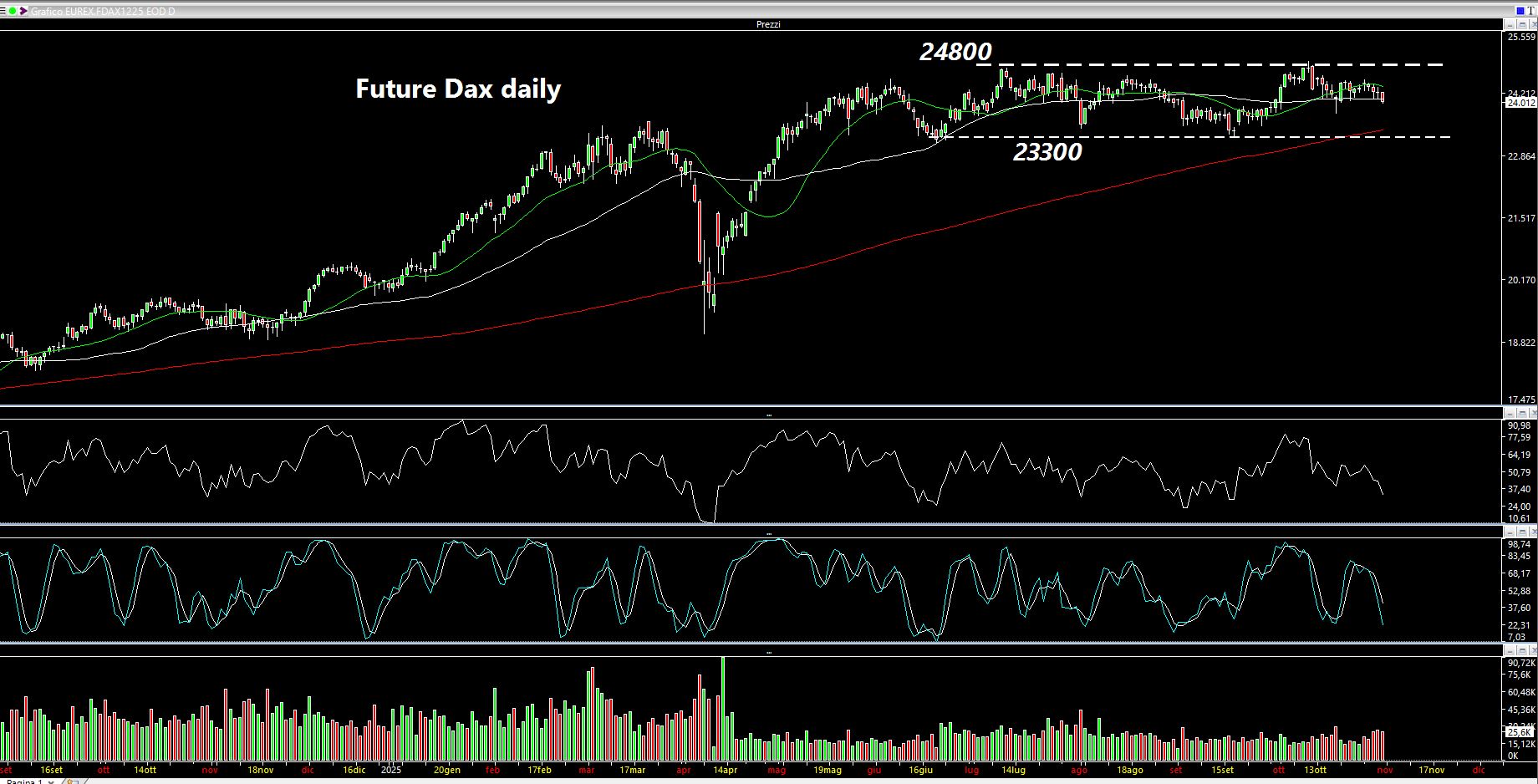 In Europa il Dax Future ha mostrato maggiore debolezza, ma la realtà è che siamo in un NON TREND e le candele rialziste e ribassiste continuano ad alternarsi come se nulla fosse. Il rettangolo rimane tra 23300 e 24800.