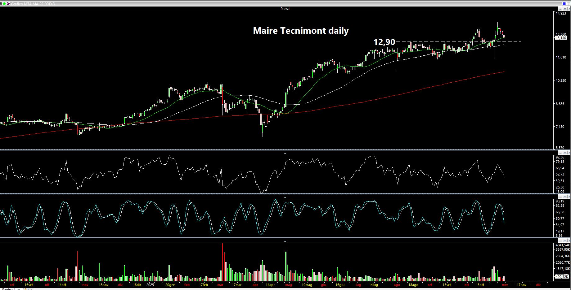 Le azioni di Maire hanno allungato già lunedì ma poi non hanno confermato il breakout del massimo storico, rientrando mano a mano. Avevo indicato un'area possibile di long compresa tra 13,10 e 13,30 euro in stop a 12,65. Venerdì il minimo è stato a 13,03 ed il close a 13,14. Personalmente non mi entusiasma quando vengono rotti i massimi storici e poi non si continua con decisione, ma non sarebbe la prima volta. Al momento siamo al pullback. Vediamo se riusciranno a stabilizzare il titolo per creare appeal sul bond. Size modica e risibile!