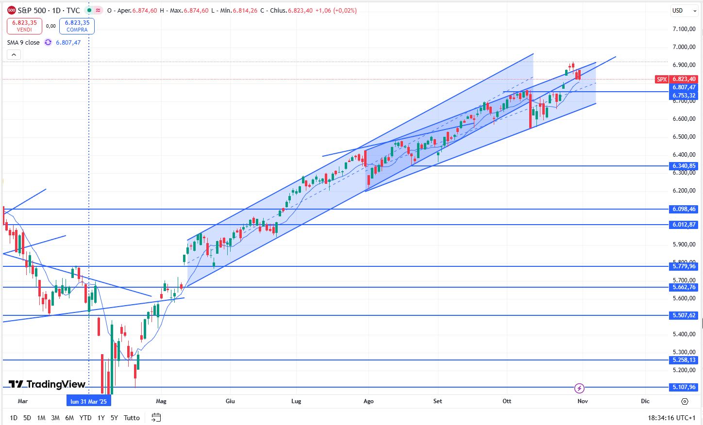 La settimana che si chiude è stata caratterizzata da una sostanziale forza dell'S&P500 da lunedì a mercoledì, mentre giovedì e venerdì abbiamo avuto una maggiore debolezza e siamo tornati al close della scorsa settimana o quasi, chiudendo così il primo gap up dello scorso weekend. Supporto di breve sull'S&P500 a 6800 punti circa. La stagionalità rimane a favore del rialzo anche se il mercato è da un lato caro e dall'altro manca la trigger per lo storno/ritracciamento. Poi come ben sapete nulla vieta che il calo possa verificarsi in un'unica seduta come successo ad inizio ottobre quando in poche ore si è bruciato il rialzo di un mese....del resto il mercato è manovrato da software, i software non ragionano ma agiscono e quindi viene a mancare quella componente umana che ha in qualche modo orientato i vari trend negli anni passati. Questo è il mio punto di vista, naturalmente opinabile.
