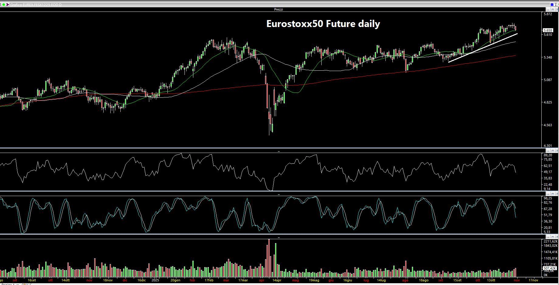L'Eurostoxx50 Future rimane sostanzialmente sui massimi ma quello che si nota è che non ci sono veri e propri allunghi: magari ci sono degli strappi in intraday ma alla fine della seduta si chiude sostanzialmente sulla parità e questo è sintomo di una mancanza di convinzione.