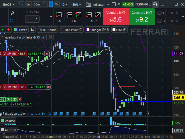 La mia personale odissea con Ferrari prosegue. La tentazione di mollare tutto, di liquidare la posizione e guardare altrove, questa settimana si è fatta forte. Molto forte. Vi ripresento il grafico, con il graffio ribassista della settimana e la ripresa finale. Io, sono ancora là.