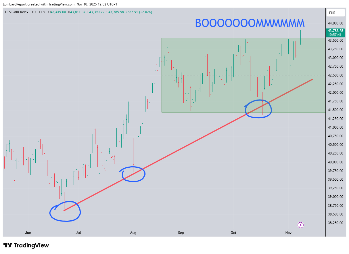 La rottura della resistenza di 44.000 del Ftse MIB40 che è anche l’obiettivo che ci eravamo dati illo tempore e che è anche il massimo storico apre uno scenario “catastrofico” per chi fa previsioni come me. Che dire ora ? A che santo aggrapparsi ? Perché finché il grafico è stretto tra resistenze e supporti il gioco è facile: se sale lo farà fino alla prossima resistenza, se scende lo farà fino al prossimo supporto. Ma quando navighi in unchartered waters (acque sconosciute dove non esistono mappe di navigazione) e dove hic sunt leones come scrivevano nella antiche cartine geografiche per significare che lì si navigava nell’ignoto.
