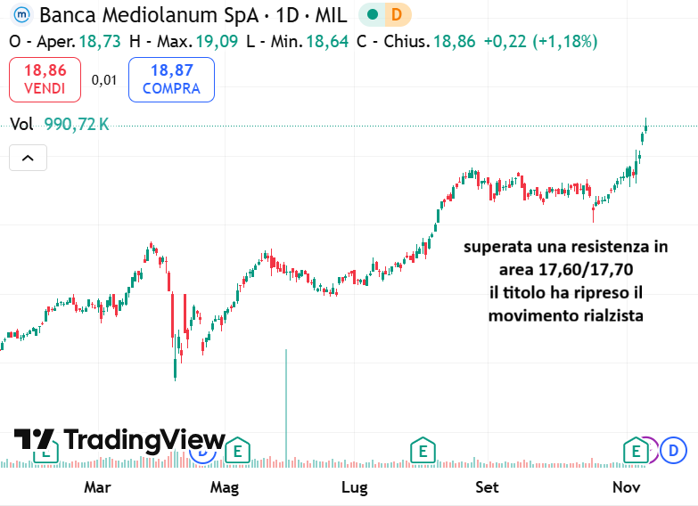 Tra la seconda metà di agosto ed inizio novembre, si è verificato uno di questi movimenti laterali, con il titolo che ha trovato una resistenza intorno ad area 17,60/17,70. Area che è stata superata con decisione la scorsa settimana. In particolare giovedì 6 novembre, giorno della pubblicazione dei risultati del primi nove mesi 2025.