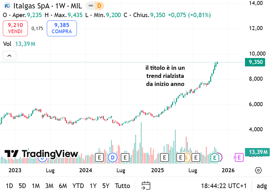 Azioni Italgas (ISIN IT0005211237) ad oggi è stata protagonista di un 2025 orientato al rialzo. Basti pensare che in chiusura di seduta il 2 gennaio di quest’anno il titolo quotava 5,125 ed ora si trova sopra quota 9; oltre ad aver fatto registrare un massimo pluriennale in settimana.