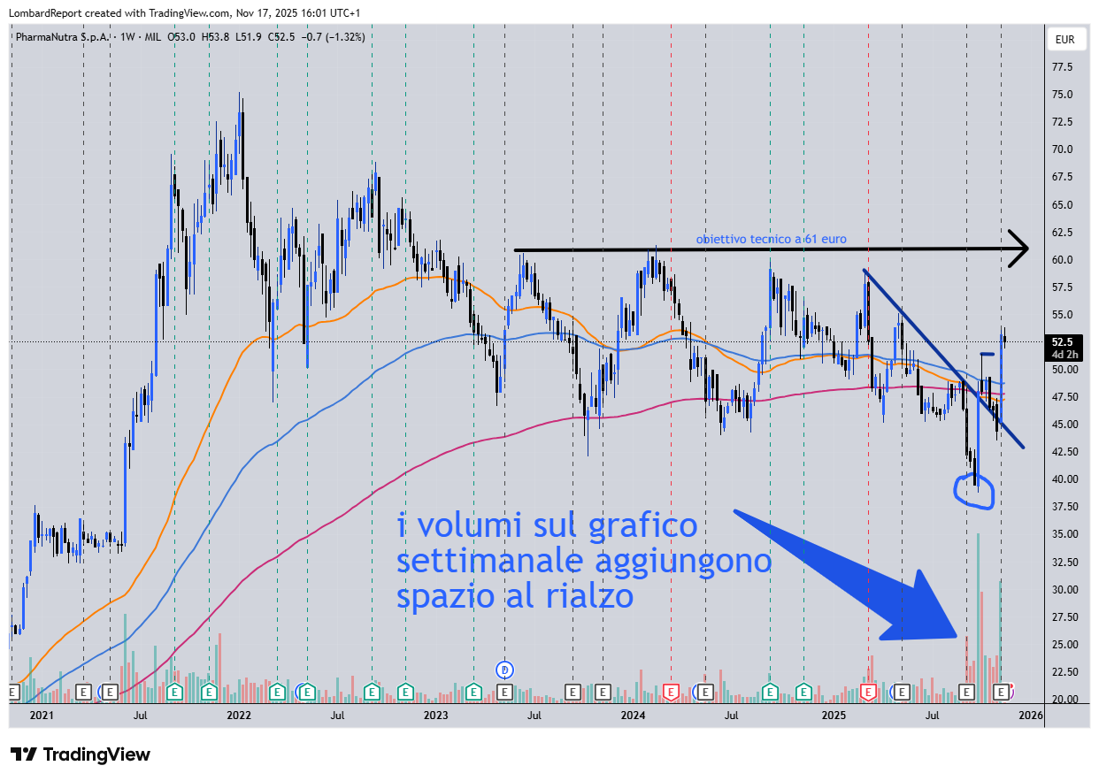 Molto più modesta la nostra previsione: attualmente l’azione Pharmanutra ha disegnato il classico scrollone sui minimi con cui le mani forti si sono liberate delle mani debole e da lì i volumi sono magicamente ritornati a salire.