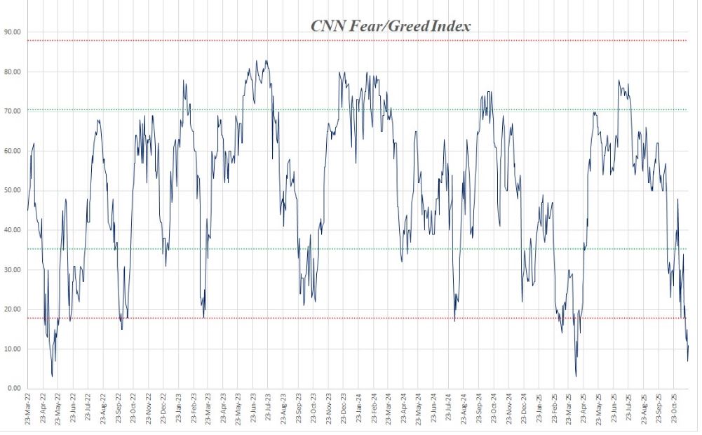 Una nota positiva può venire dal Fear&Greed Index della CNN che si trova su livelli quasi paragonabili a quelli di Aprile (dazi e Liberation Day): forse il segno di un eccessivo sbilanciamento di breve?