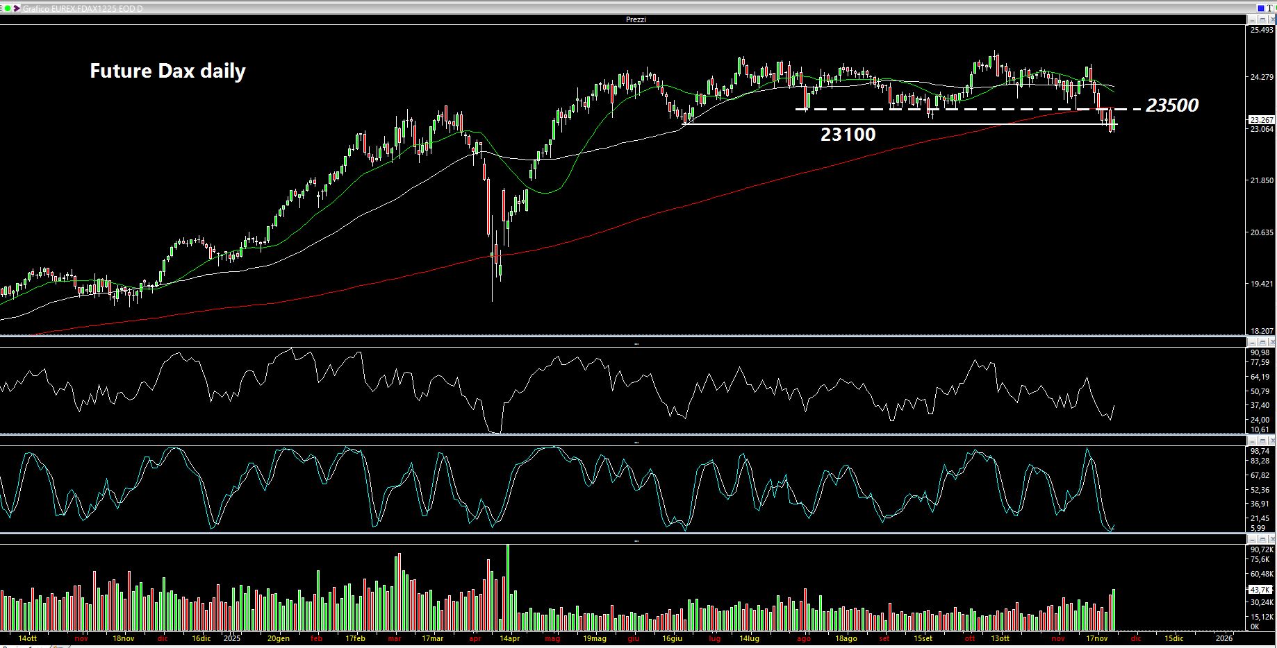 In Europa il Dax Future è "comandato" dalla candela di giovedì parzialmente "rimangiata" dalla inside bar di venerdì. Positività con chiusure SOPRA i 23500 (ex supporto ora resistenza che guarda caso coincide sostanzialmente con i massimi di giovedì). Negatività sotto i minimi di giovedì a 23000 con un alert se non si riuscissero a tenere i 23100 rispetto al close a 23267 quindi de facto ci siamo portati su quel famoso supportone o fascia supportiva indicata sabato scorso.