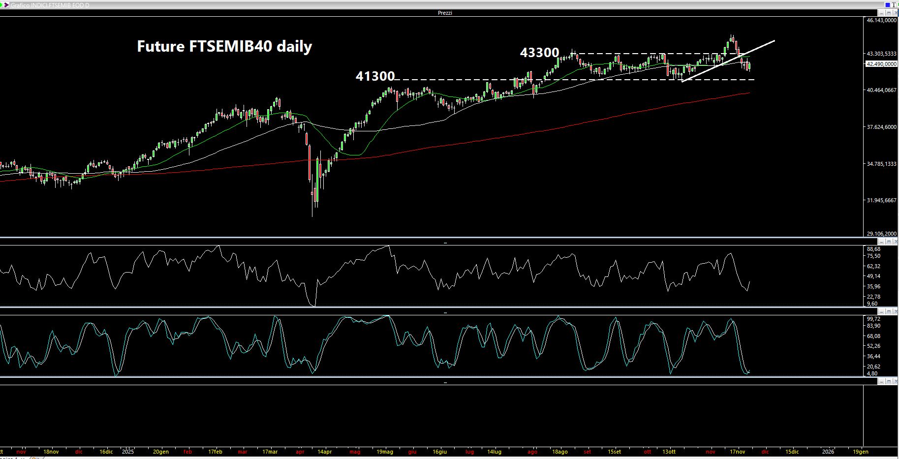 Il nostro derivato FTSEMIB40 alla fine non è riuscito a tenere i 43300 punti ed ha chiuso a 42490. Supporto successivo a 41300. Di fatto siamo potenzialmente rientrati all'interno del rettangolone 41300-43300