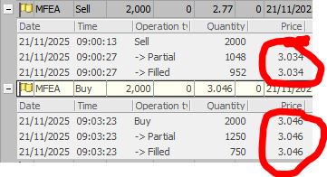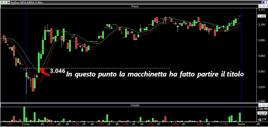 Faccio un esempio di un trade in stop nella seduta di ieri. Complice la brutta apertura dei mercati decido di entrare short su MFEA (MediaForEurope, la ex Mediaset per intenderci) ma con una size risibile: 2000 pezzi al prezzo di 3.034. Il quotatore aveva creato spread sul book e quindi decido di sfruttarlo mettendomi primo bid un tick sotto il primo ask....ed ecco che magicamente il software revoca la lettera e si mette più in alto: un chiaro segno che non è tarato sul sell altrimenti mi avrebbe eseguito istantaneamente. Ed effettivamente, magia delle magie, guardate come ha poi fatto partire all'insù l'azione proprio in quel punto! Questo ci fa capire che quando un qualunque operatore immette un ordine i software lo precedono e si rincorrono tra di loro e questo permette appunto di manipolare in modo artificiale e truffaldino i prezzi dei vari titoli: non c'è una reale volontà di acquistare, ma solo ordini che si rincorrono finché qualcuno non butta un grosso ordine in vendita e quindi ribaltano (questa volta al contrario) il book.