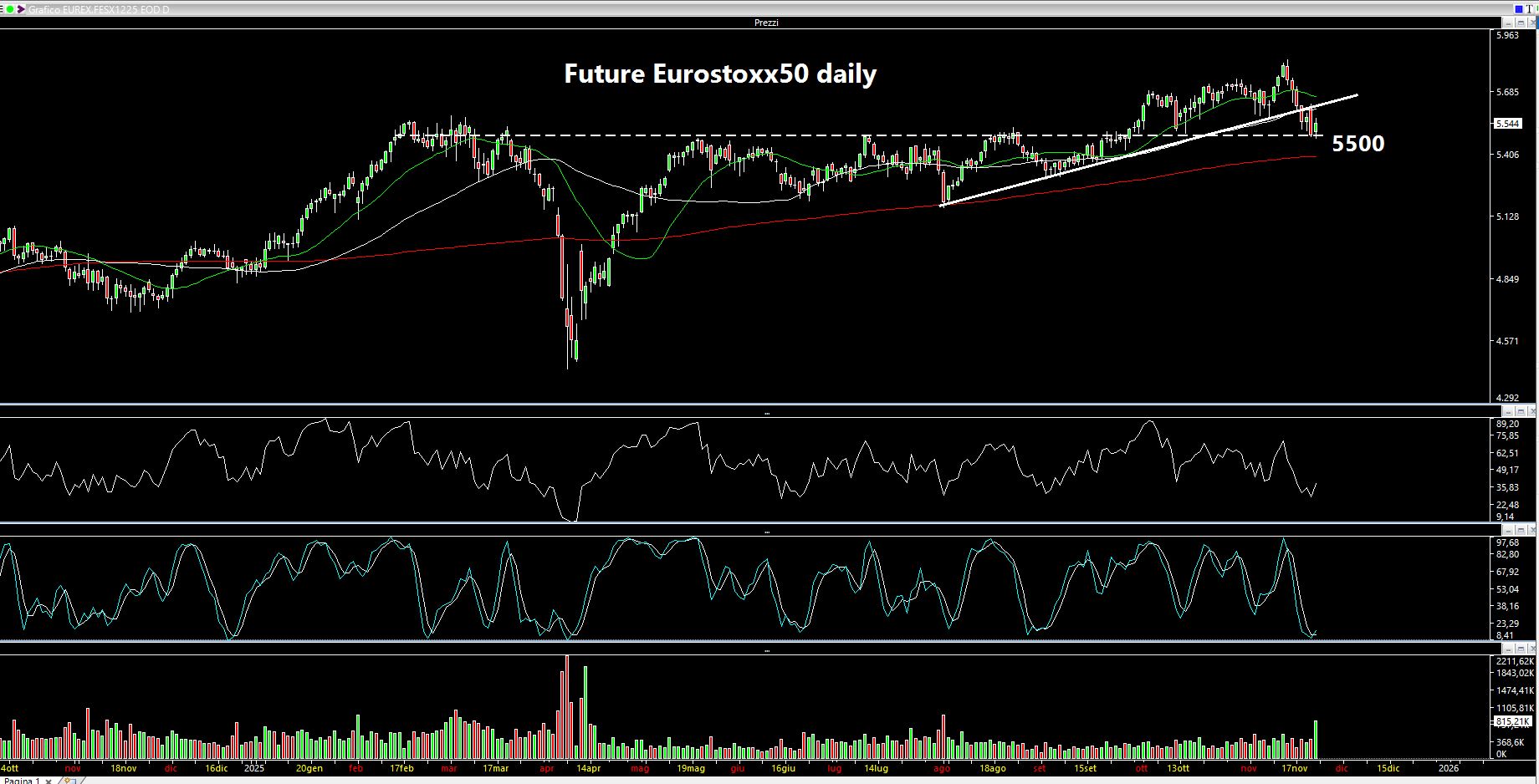 L'Eurostoxx50 si trova in una situazione meno problematica ma comunque delicata: supporto testato a 5500 e rottura della trendline dinamica tracciata la scorsa settimana. Sotto i 5500 si potrebbe testare la media a 200 periodi di colore rosso attualmente passante a 5400. L'unico aspetto positivo è il forte ipervenduto di breve.
