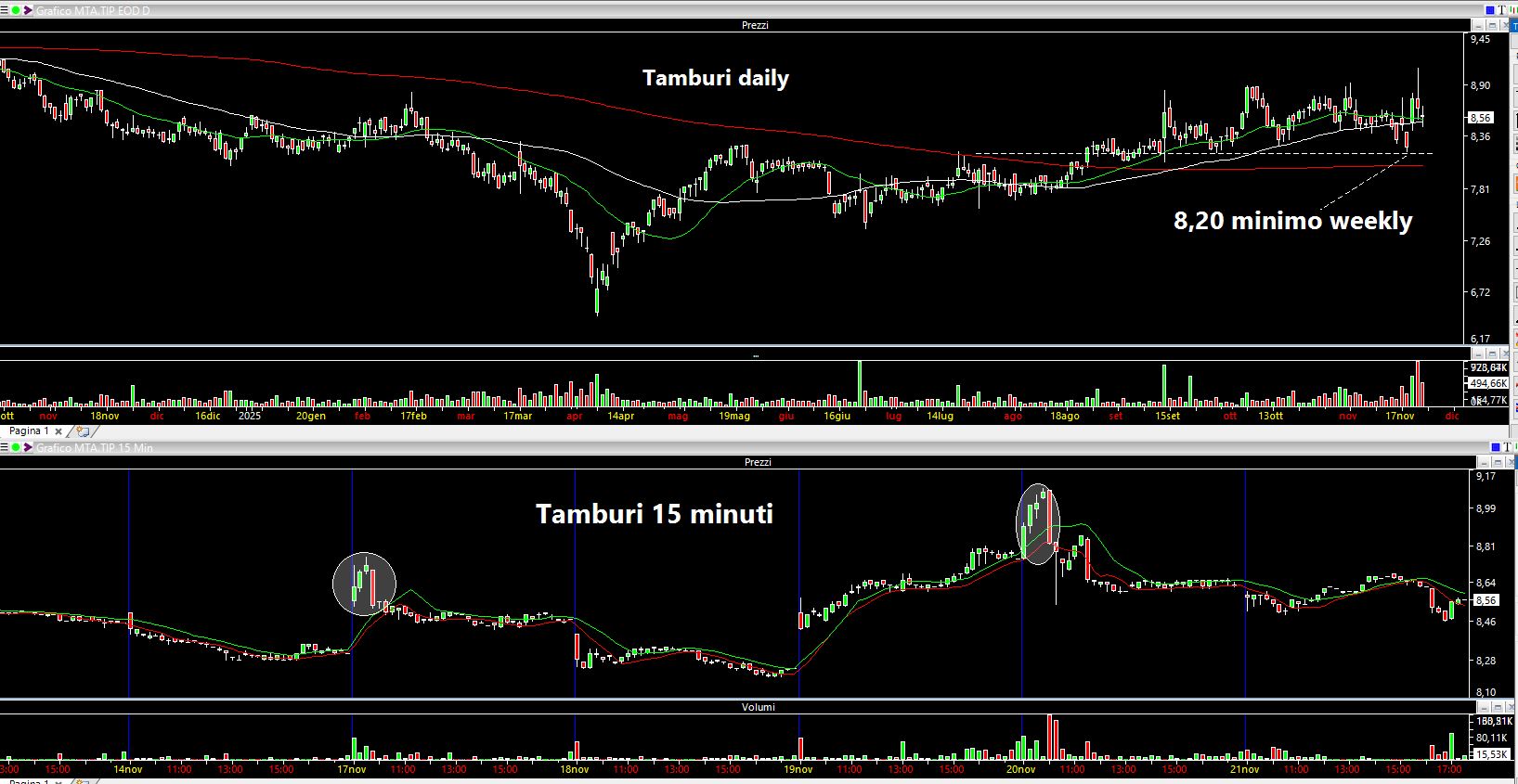 La scorsa ottava ho segnalato Tamburi in seguito ai conti pubblicati (link: https://www.lombardreport.com/2025/11/15/azioni-mediobanca-azioni-tamburi/), azione che ha aperto l'ottava quasi nel mezzo della fascia indicata (8,60) ed esattamente al prezzo di 8,55 euro (la fascia indicata era compresa tra 8.20 euro di base (che sono stati il minimo settimanale) e 8.90-9.00 di altezza (massimo settimanale a 9,08 euro)). Precedentemente ho menzionato la tecnica con cui qualcuno fa "ribaltare" le macchinette: prima si sfrutta il fatto che gli ordini vengono "scavallati" e quindi il software si alza in automatico. Poi ad un certo punto arriva una spazzolata su più livelli e il quotatore che comprava è costretto a invertire la rotta per liquidare la posizione. Osservate come anche in questo caso sia avvenuto ciò in ben due sedute della settimana (aree cerchiate sul grafico a 15 minuti). La prima lunedì post pubblicazione conti: tre candele rialziste da 15 minuti per far alzare il software e poi qualcuno ha spazzolato tutto all'ingiù per andare poi a testare 8,20 euro. Stessa cosa giovedì: quattro candele rialziste da 15 minuti e poi con una ribassista la macchinetta si è ribaltata facendo poi chiudere il titolo sui livelli di apertura settimanali (un tick sopra per essere precisi).