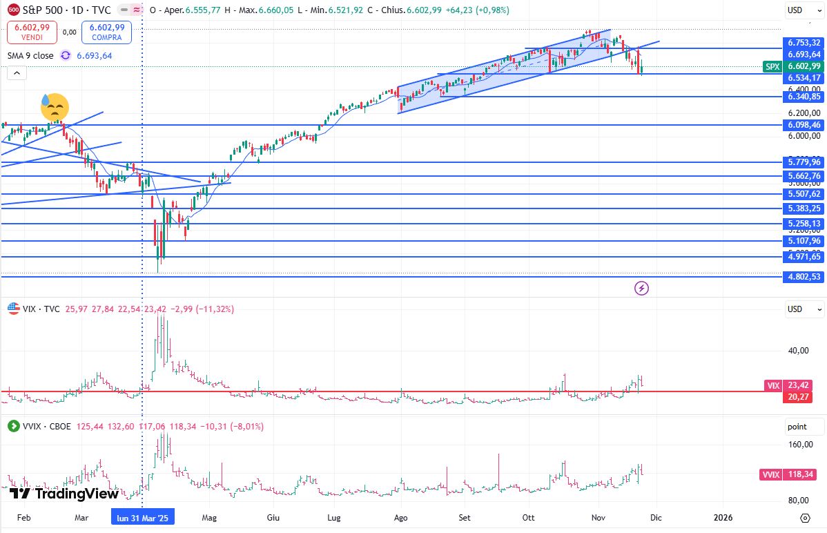 Si chiude una settimana impegnativa per i mercati azionari, in primis americani. L'intuizione della settimana scorsa di fondere le diverse candele daily non è stata così sbagliata. L'S&P500 ha infatti aperto l'ottava invariato o con un leggero rialzo, poi sono prevalse le vendite specialmente nella seduta di giovedì quando i software descritti giovedì sera hanno agito in modo simultaneo affossando tutto il listino. Del resto come ho avuto modo di scrivere più volte l'inghippo sta nel fatto che basta far salire o scendere un paio di società per manipolare tutto il mercato in un verso o nell'altro. Giovedì ad esempio NVDA ha aperto in gap up e poi ha chiuso la seduta con una bruttissima candela rossa e così ha fatto anche il mercato inizialmente in rialzo del 2% e in close ha segnato -1.5%. Una escursione tra massimo e minimo del 3,5% sull'indice più capitalizzato al mondo è tanta roba . Per la prossima ottava: supporti sui minimi di giovedì e venerdì in area 6530. Sotto il supporto successivo è collocabile a 6340. Al rialzo resistenza sui massimi di giovedì a 6750-6760. Al momento la candela che comanda è quella di giovedì: positività se si chiude sopra il massimo, negatività se si chiude sotto. Un'ultima considerazione: all'inizio di ottobre abbiamo avuto un barrone rosso in occasione delle solite dichiarazioni di Trump sui dazi (vado a memoria). Francamente mai e poi mai mi sarei aspettato una serie di inside bars e poi di una risalita successiva. In quell'occasione tuttavia eravamo all'interno di un canale rialzista mentre ora non lo siamo più. Occorre che la volatilità si riporti sotto 20 affinché si riduca la tensione sui listini. Al momento ha chiuso a 23,42 punti ma si era portata più in alto.