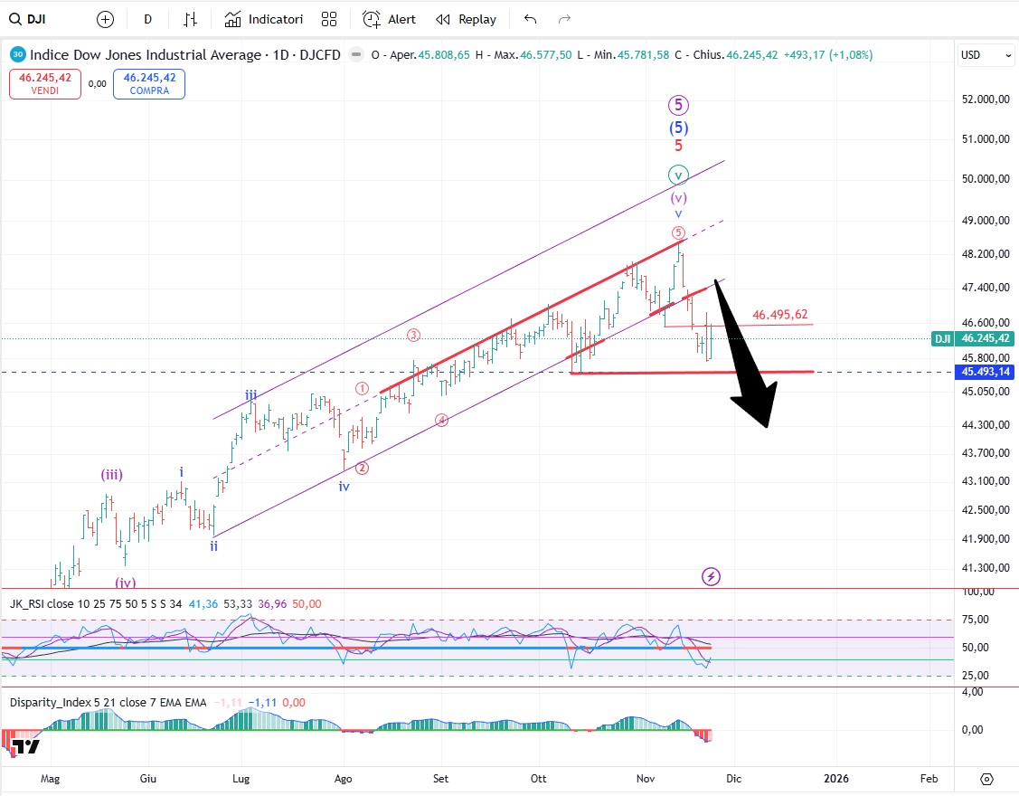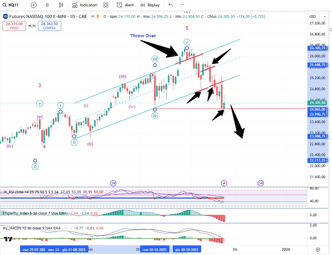 Il minimo intraday di venerdì conferma il minimo dell’S&P500. Sul breve termine il Nasdaq100 come tutto il copione dal massimo del 30 ottobre. Anqua abbiamo avuto il throw over e a seguire la discesa a testare il supporto del bordo inferiore del canale di trend il successivo rimbalzo fermato dalla mediana del canale e la discesa con rottura del bordo inferiore del canale, il retesting da sotto della trendline del canale e la discesa che trova supporto nella seduta di giovedì sul precedente minimo di onda [iv]. Venerdì il tentativo di rimbalzo riuscito a metà con rottura intraday del minimo di onda [iv]. Una rottura decisa del minimo di onda [iv] innescherà una nuova ondata di vendite.