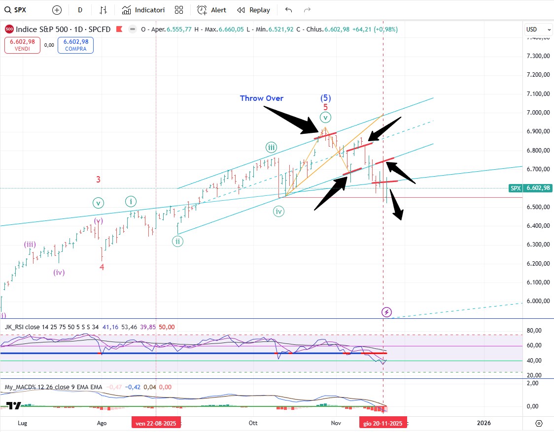 Una situazione diversa (perché interessa la parte superiore del canale), ma abbastanza simile nella sostanza a quanto visto sul Dow Jones la ritroviamo sull’S6P500. Anche qua dobbiamo aspettare delle conferme. La p rima sarà la rottura al ribasso del minimo di venerdì a quota 6521,92.