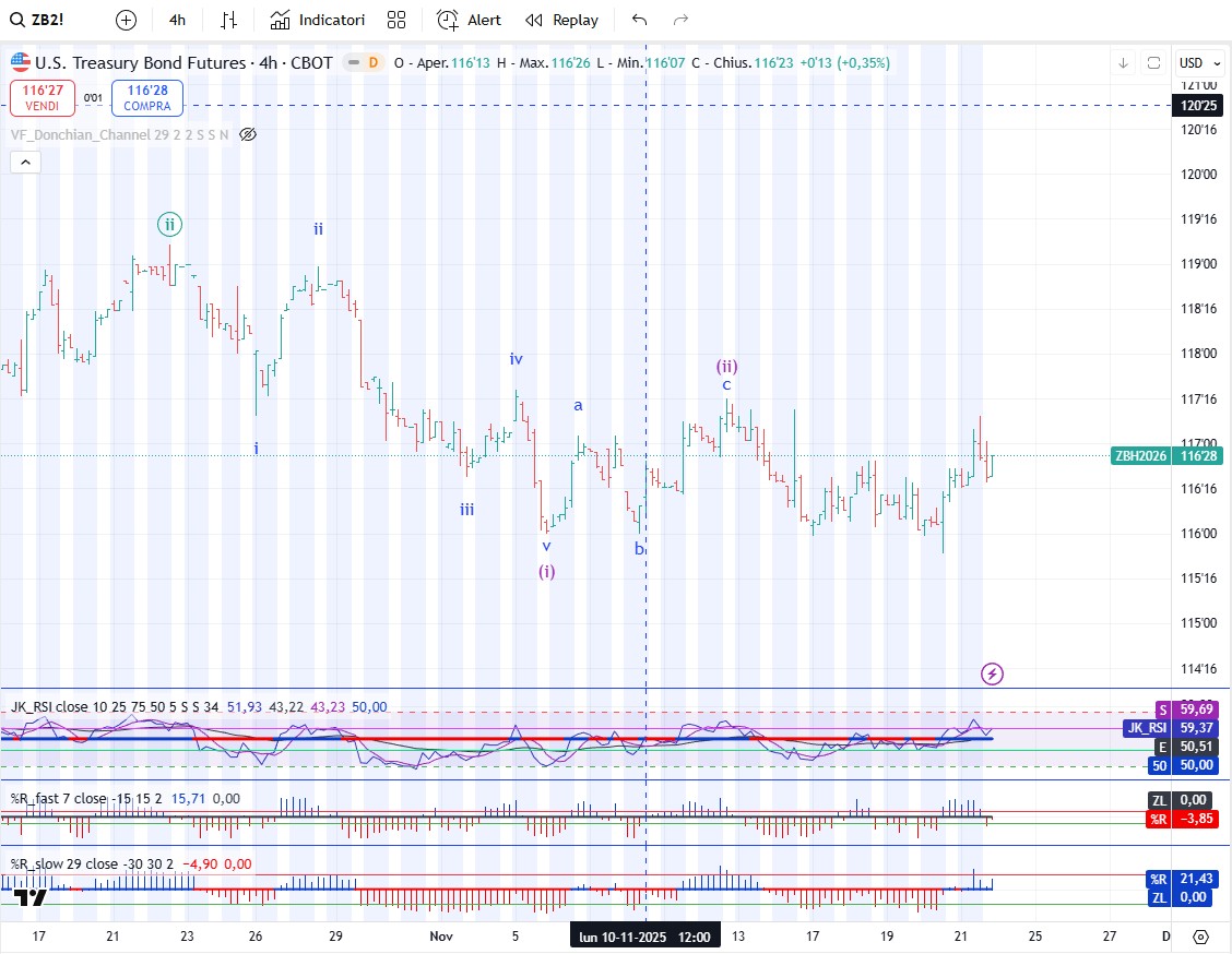 I prezzi del trentennale americano che abbiamo trascurato negli ultimi mesi hanno completato un onda (ii) di grado minuette con un modello flat a quota 117,27 il 12 novembre scorso. Il pattern successivo a questo massimo per ora si presta a diverse interpretazioni, ma se l’onda (ii) è effettivamente terminata le sub onde più recenti devono far parte dell’onda (iii) con conseguente calo dei prezzi. Al contrario una spinta sopra 117,27creerà più opzioni.