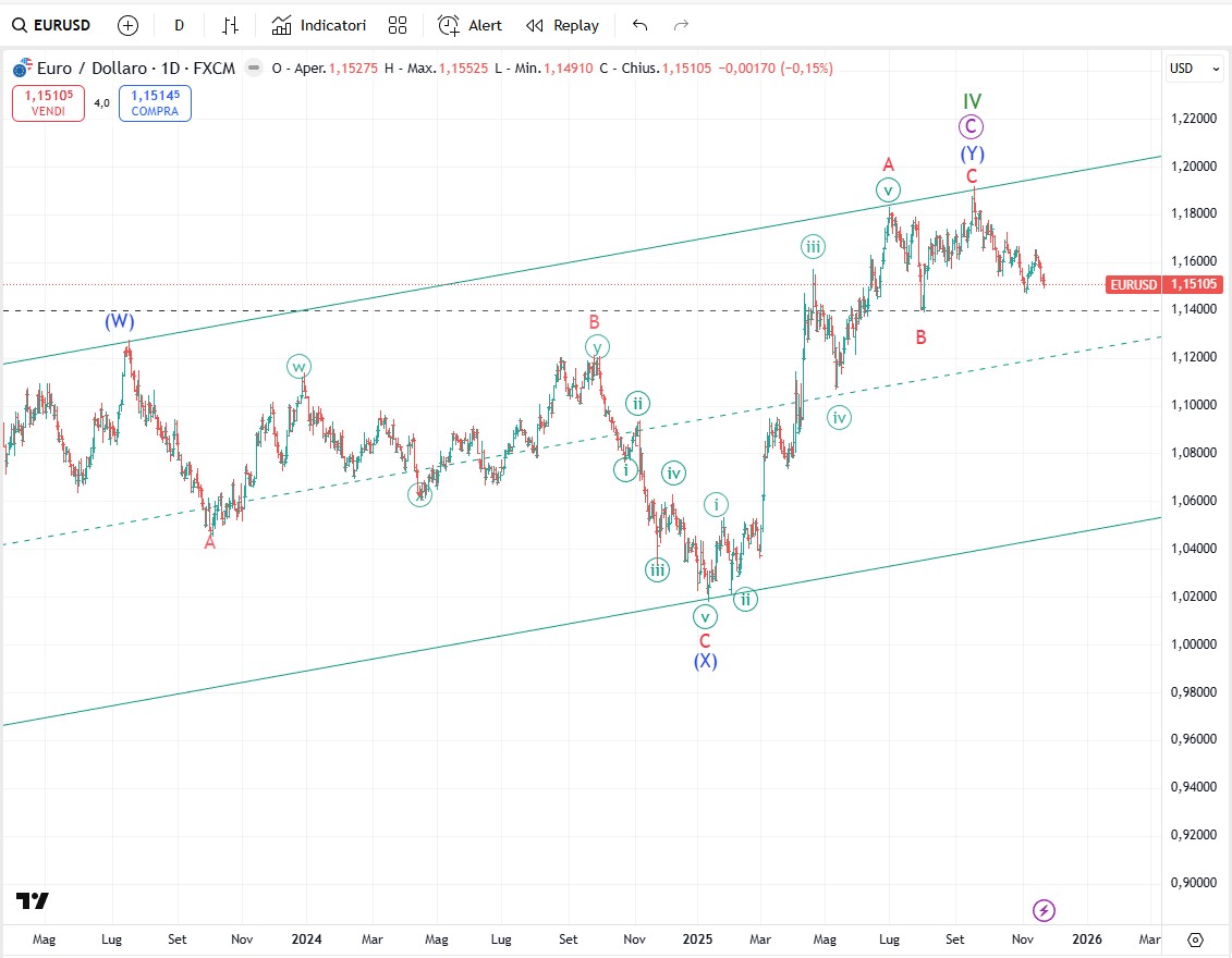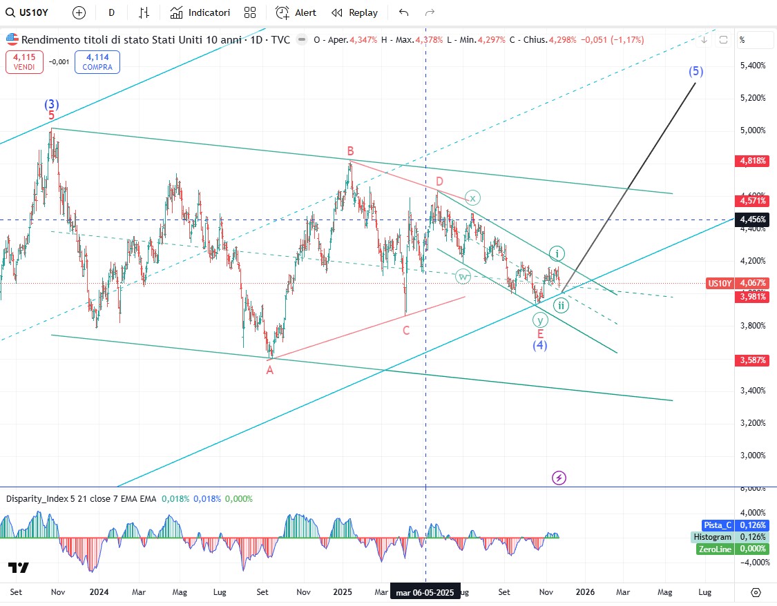 Il modelle delle subonde di breve termine sul decennale del tesoro americano sono leggermente cambiate ma in sostanza non cambia nulla. Sul grafico a 2 ore si può vedere che l’onda (iv) di [i] ha formato un piccolo triangolo ma questo a livello daily ci costringe solo a spostare il massimo di onda [i] leggermente più avanti. Il ribasso successivo è l’onda [ii] che se non è finita è comunque in fase di ultimazione e dopo l’onda [iii] dispiegherà le ali del rialzo a meno di ulteriori colpi di scena per ora non ipotizzabili.