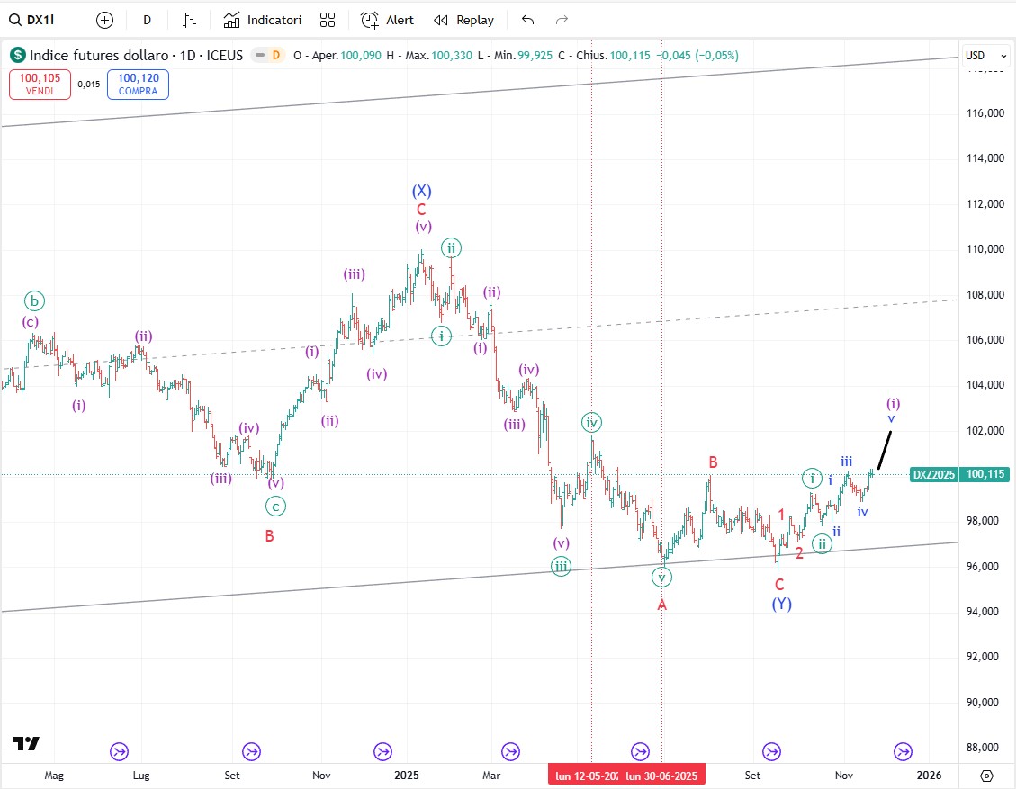 Il Dollar Index venerdì ha superato di poco quota 100,30 un massimo intraday a 100,395 superando di misura il massimo di onda ii di grado subminuette creando quindi le condizioni di minima per l’onda (i) di grado minuette anche se oggettivamente mi aspetterei una conclusione un pò più in alto. Se l’onda (i) termina ora o leggermente più su, la successiva onda (ii) riporterebbe con ogni probabilità i prezzi verso quota 99 o sotto. Un rally verso quota 102 invece potrebbe mantenere la successiva onda (ii) attorno a quota 100 o appena sotto. In tutti i casi, comunque vada, dopo il minimo del 17 Settembre per il dollaro USA si apre la strada verso il più grande rally dal massimo del 2022. Dovremo tenerne conto anche sull’andamento dei prezzi delle commodity.