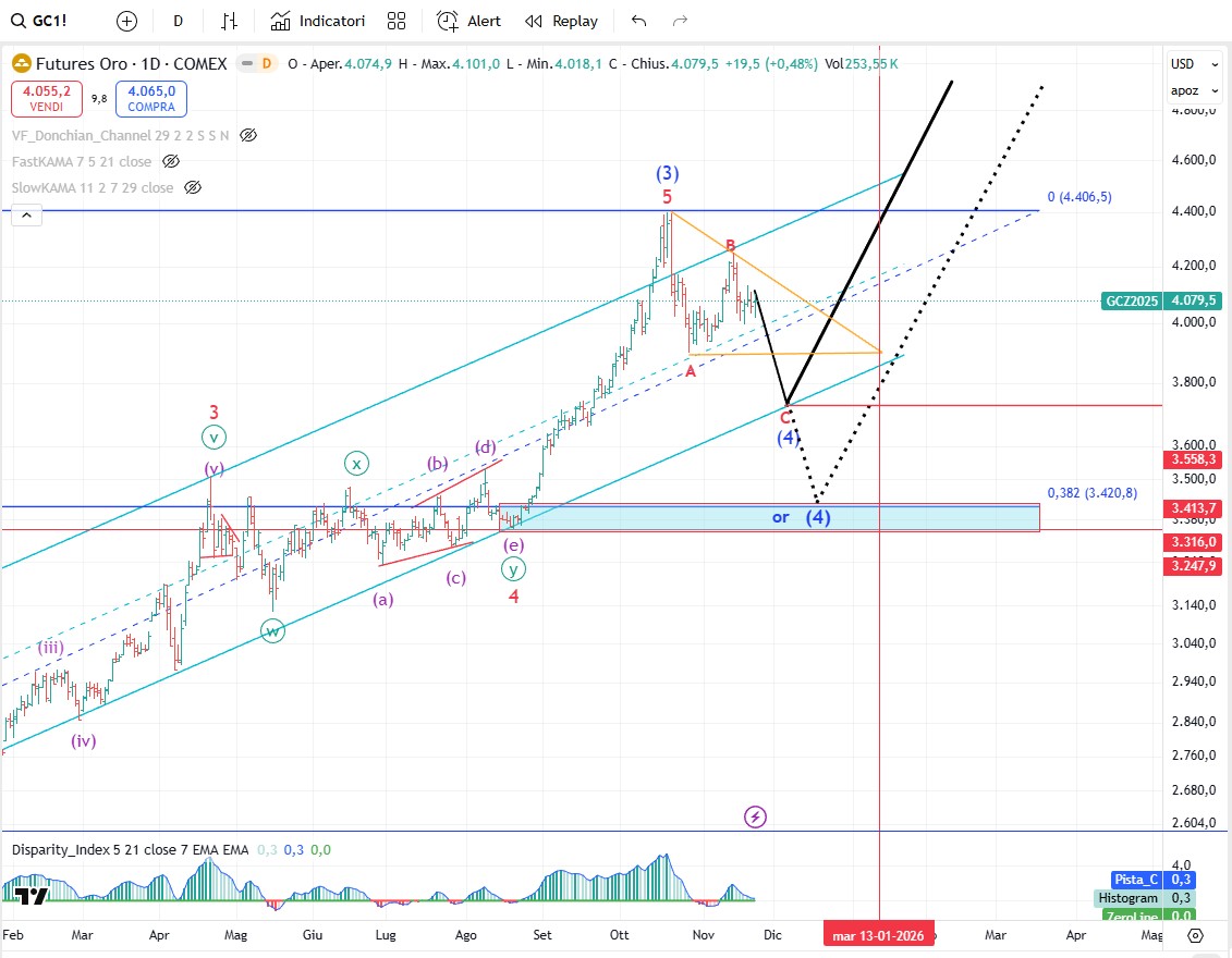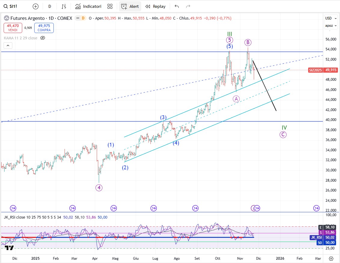 L’oro continua a tracciare un perfetto ABC che dovrebbe terminare come minimo sulla trendline inferiore del canale ma che potrebbe estendere finoa alla zona della precedente onda 4. Conisderando che Cina e India continuano a comprare oro come se non ci fosse un domani si puo ipotizzare che il completamento della correzione non sarà questione di giorni o di un paio di settimane ma richiderà qualche mese. Ma queste son solo supposizioni mie.